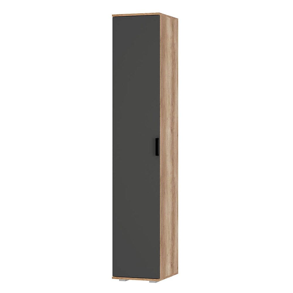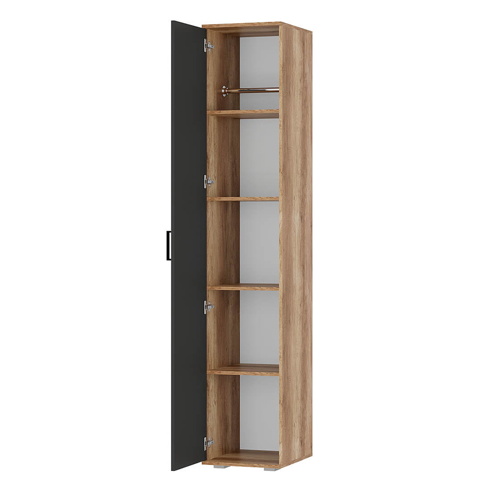 Пенал "Вегас" ПН-01 - универсальное решение для вашей гостиной. Модель можно разместить как в центральной, так и в угловой зоне. Пять просторных полок позволят рассортировать все нужные вещи — книги, документы и повседневную одежду. Матовая графитовая дверь с эргономичной ручкой контрастного чёрного цвета сбалансирует яркий интерьер или гармонично впишется в комнату в пастельных оттенках. Наполнение комбинированное: хромированная штанга и полки в комплекте.