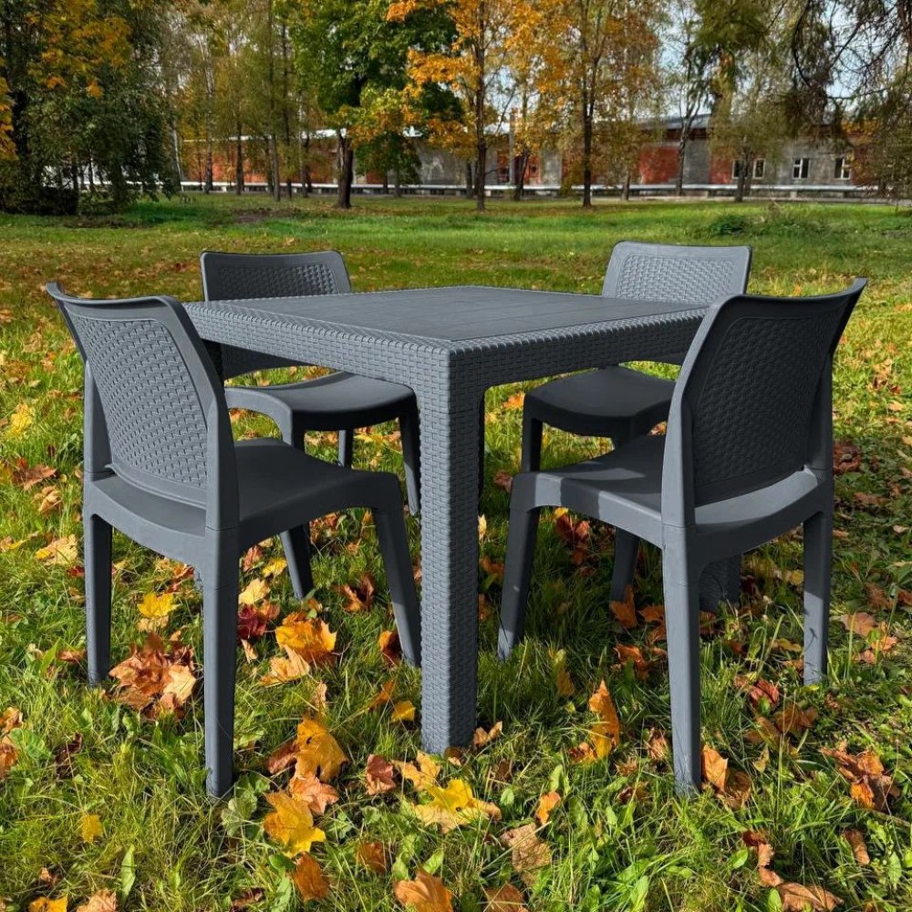 Этот набор включает просторный стол размером 95х95х75 см и четыре комфортабельных стула 49х52х84 см, созданных из высокопрочного пластика, отличающегося высокой износостойкостью и легкостью в уходе.