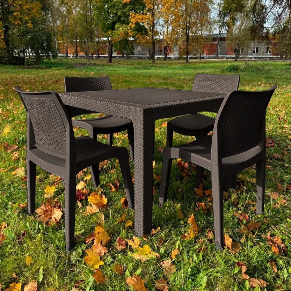 Этот набор включает просторный стол размером 95х95х75 см и четыре комфортабельных стула 49х52х84 см, созданных из высокопрочного пластика, отличающегося высокой износостойкостью и легкостью в уходе.