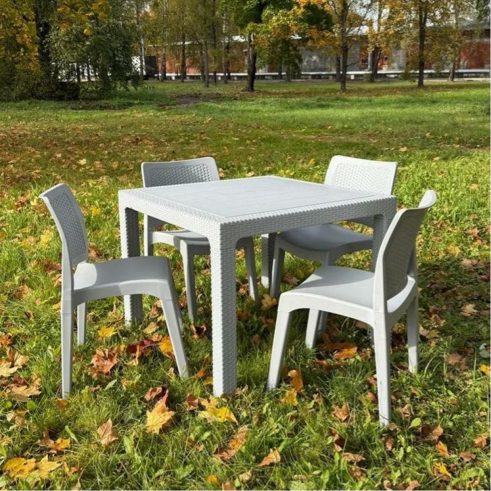 Этот набор включает просторный стол размером 95х95х75 см и четыре комфортабельных стула 49х52х84 см, созданных из высокопрочного пластика, отличающегося высокой износостойкостью и легкостью в уходе.