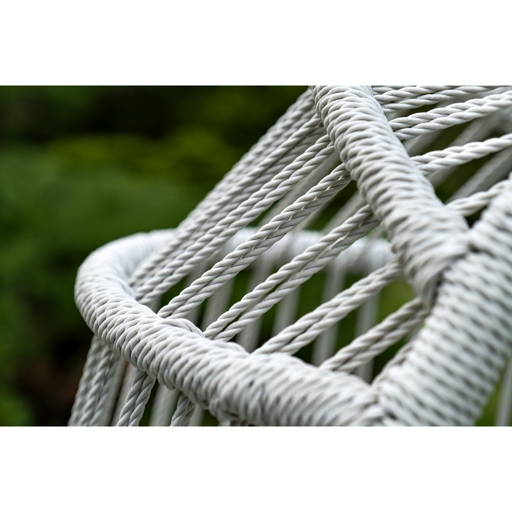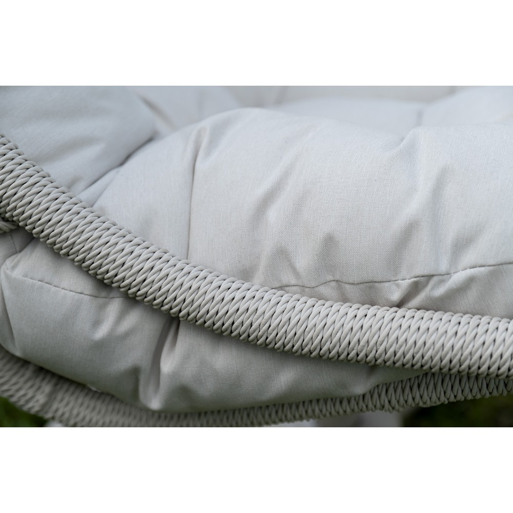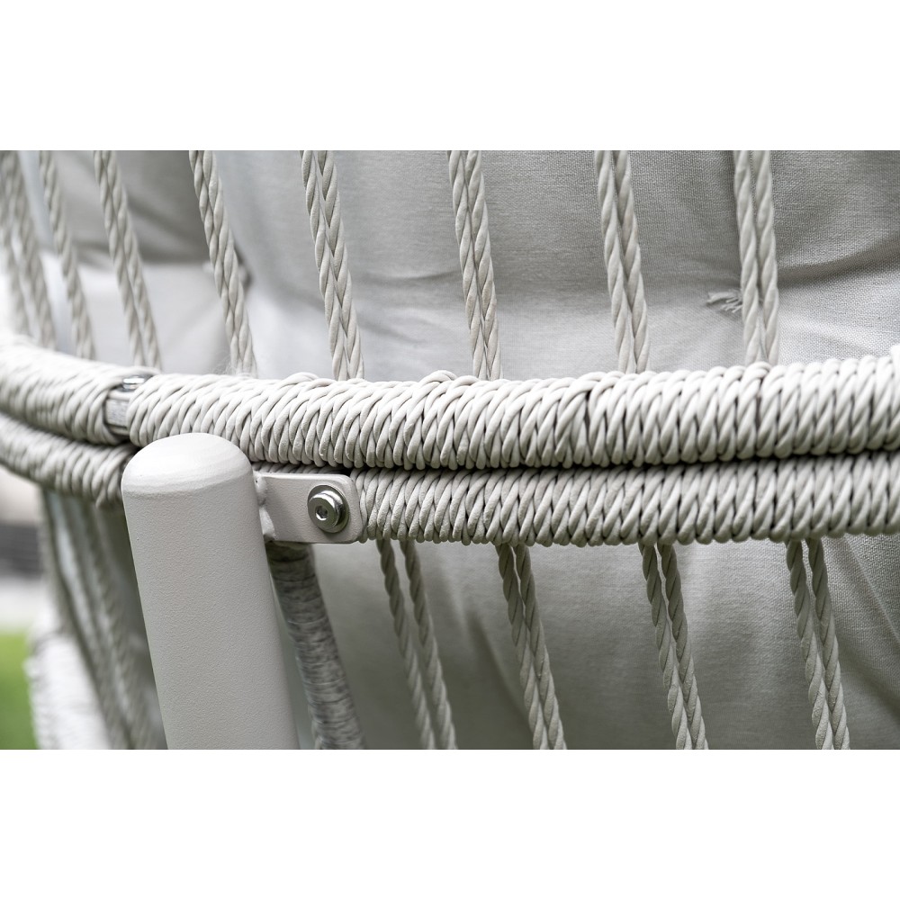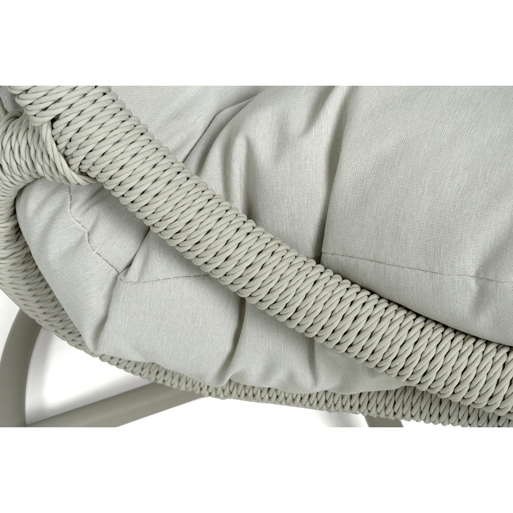 Каркас изготовлен из стали, окрашенного порошковой износостойкой краской белого цвета. Оплетка – плоский искусственный ротанг светло-серого оттенка. Материал устойчив к перепадам погоды и подходит для использования на открытых пространствах.
