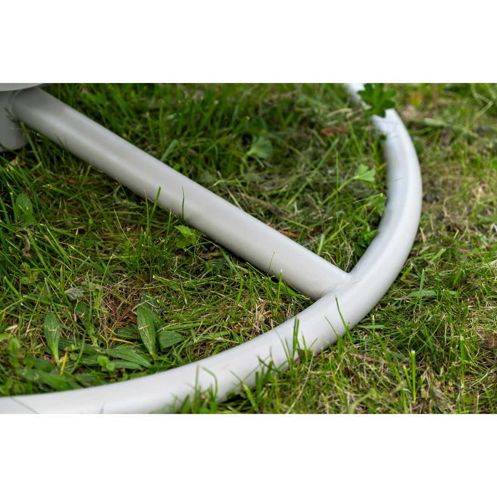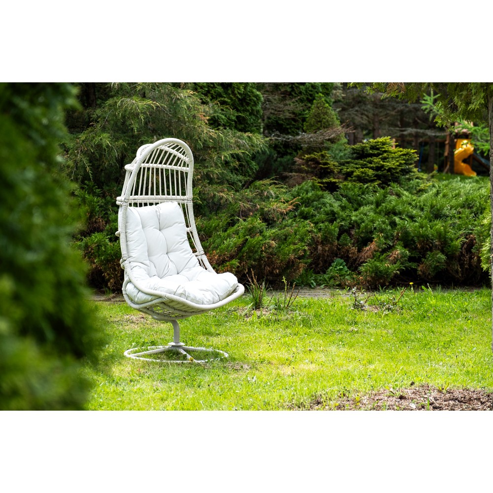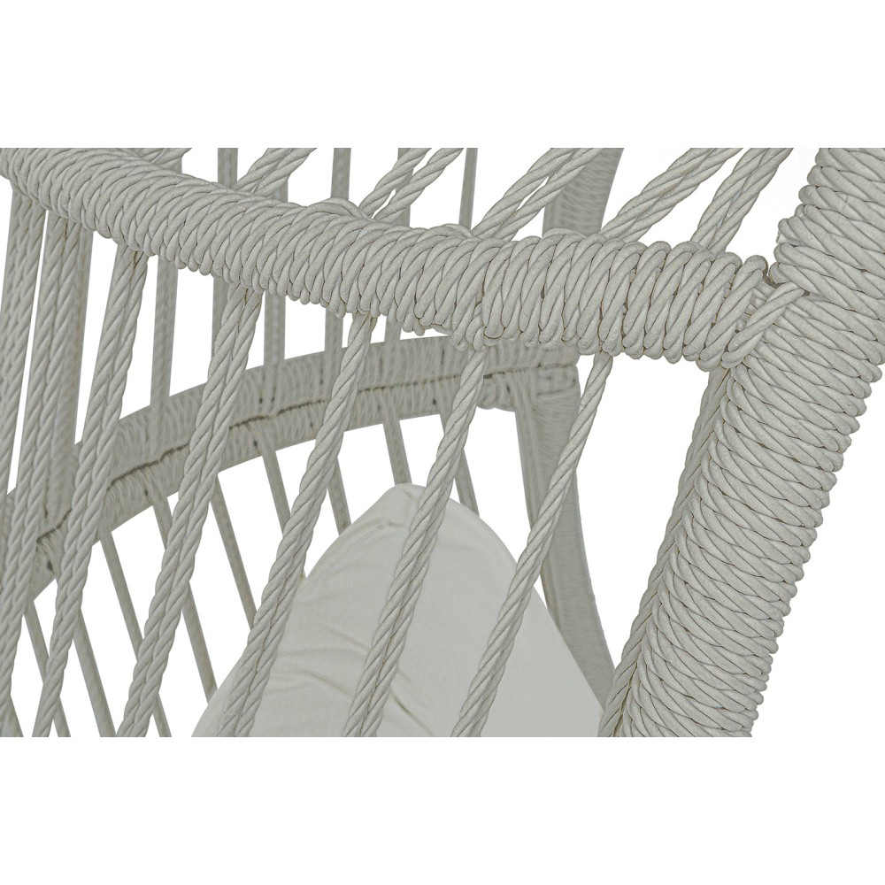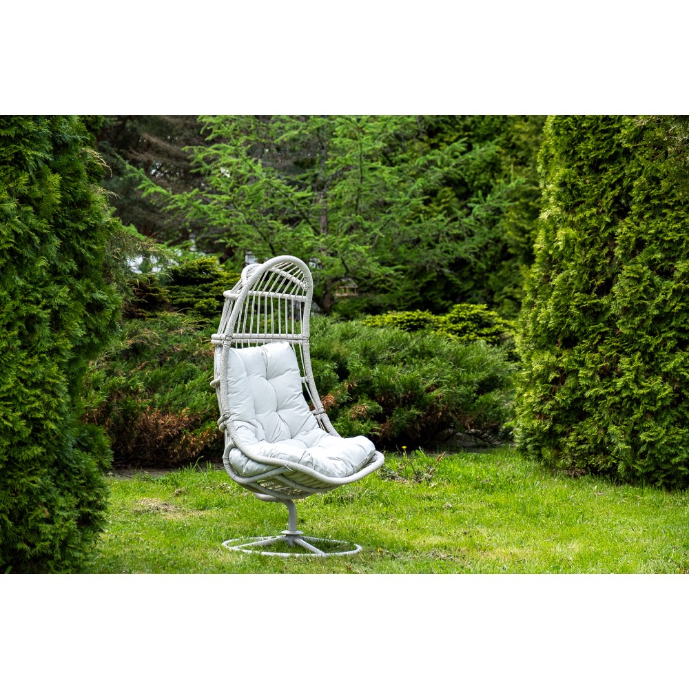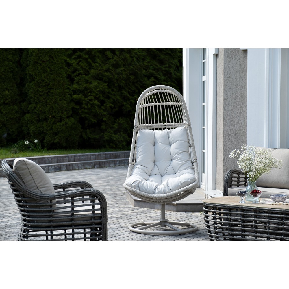 Каркас изготовлен из стали, окрашенного порошковой износостойкой краской белого цвета. Оплетка – плоский искусственный ротанг светло-серого оттенка. Материал устойчив к перепадам погоды и подходит для использования на открытых пространствах.