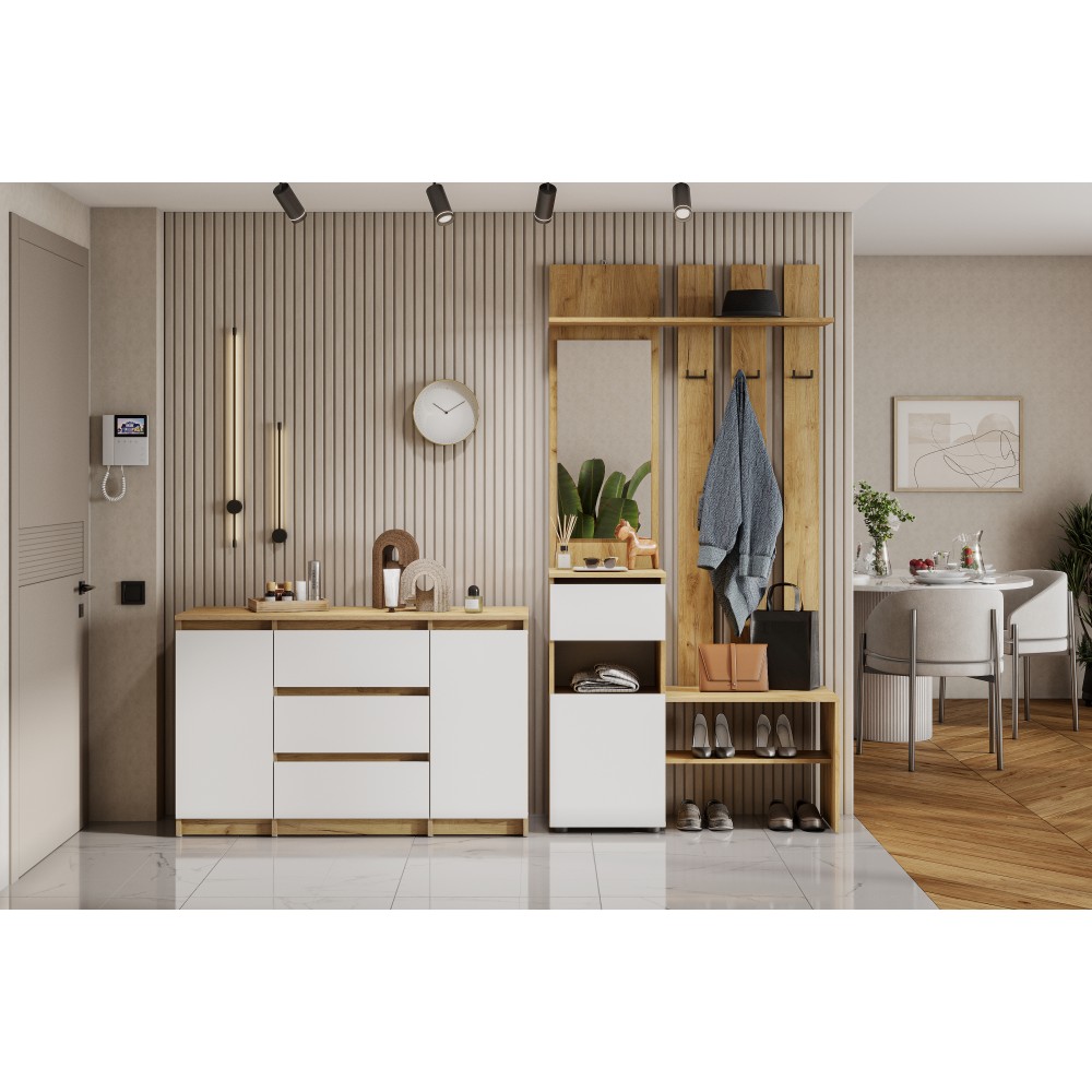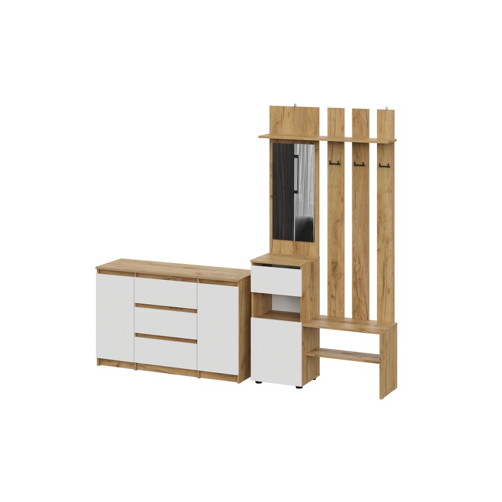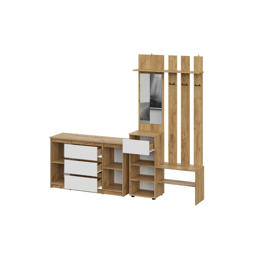 Прихожая Денвер поможет организовать систему хранения гардероба у вас дома. Для вашего удобства предусмотрены двухрожковые крючки для повседневной верхней одежды, широкая верхняя полка для головных уборов и шарфов, ниша для обуви, а также выдвижной ящик. За распашным фасадом находятся небольшие полки. Зеркало позволит оценить внешний вид перед выходом из дома. Вешалка легко крепится к стене, сборка универсальная.