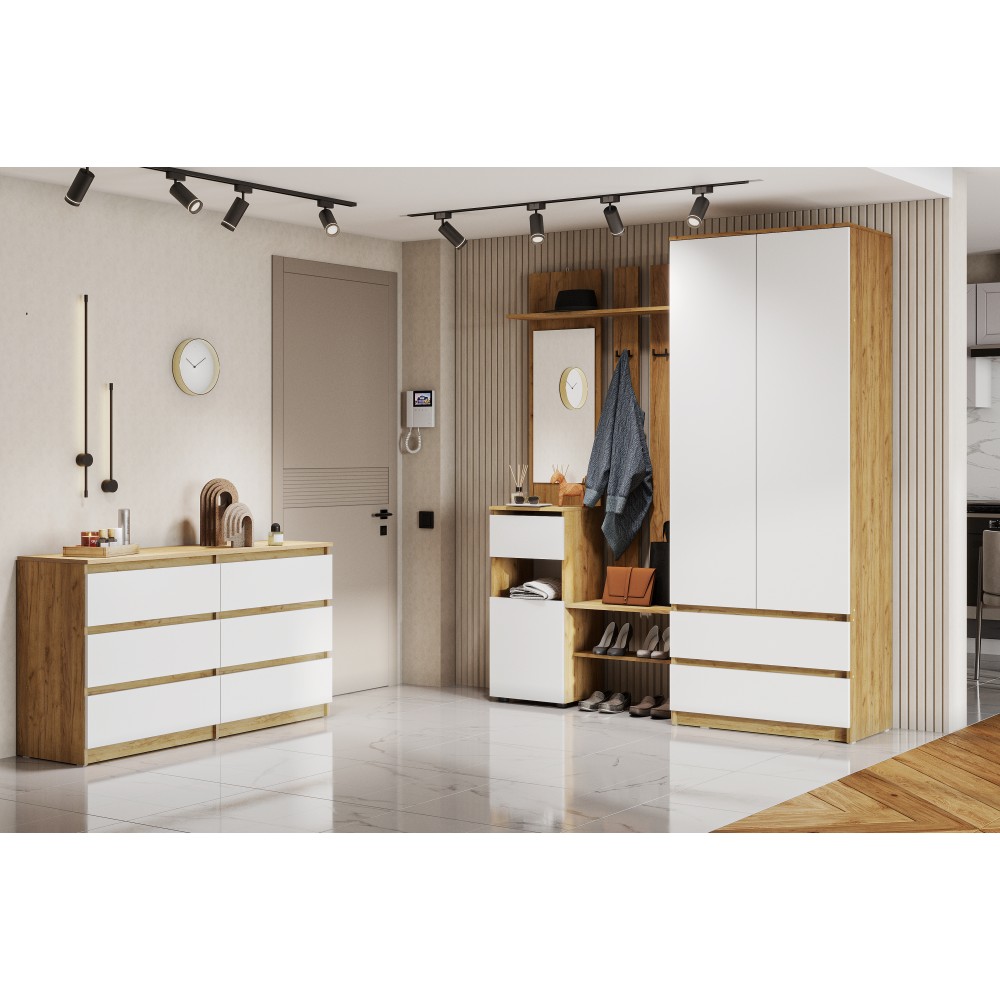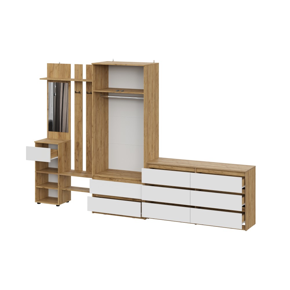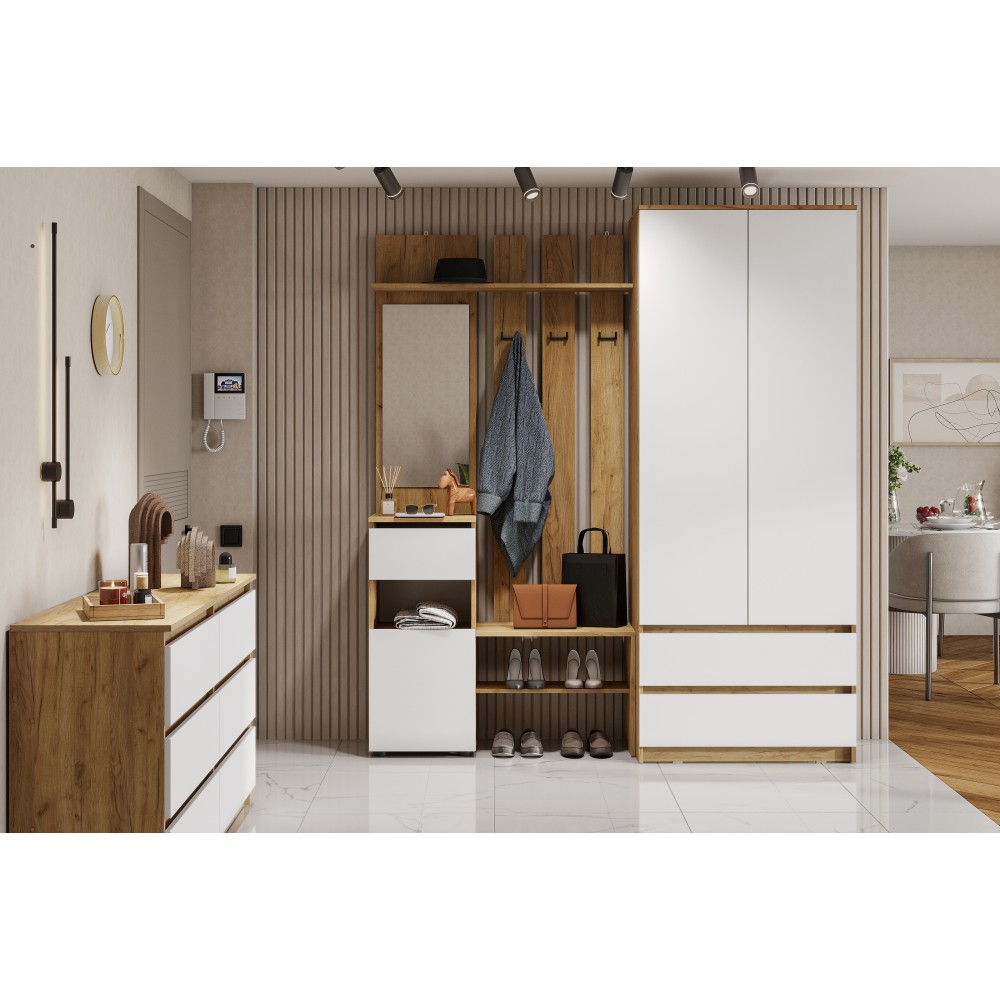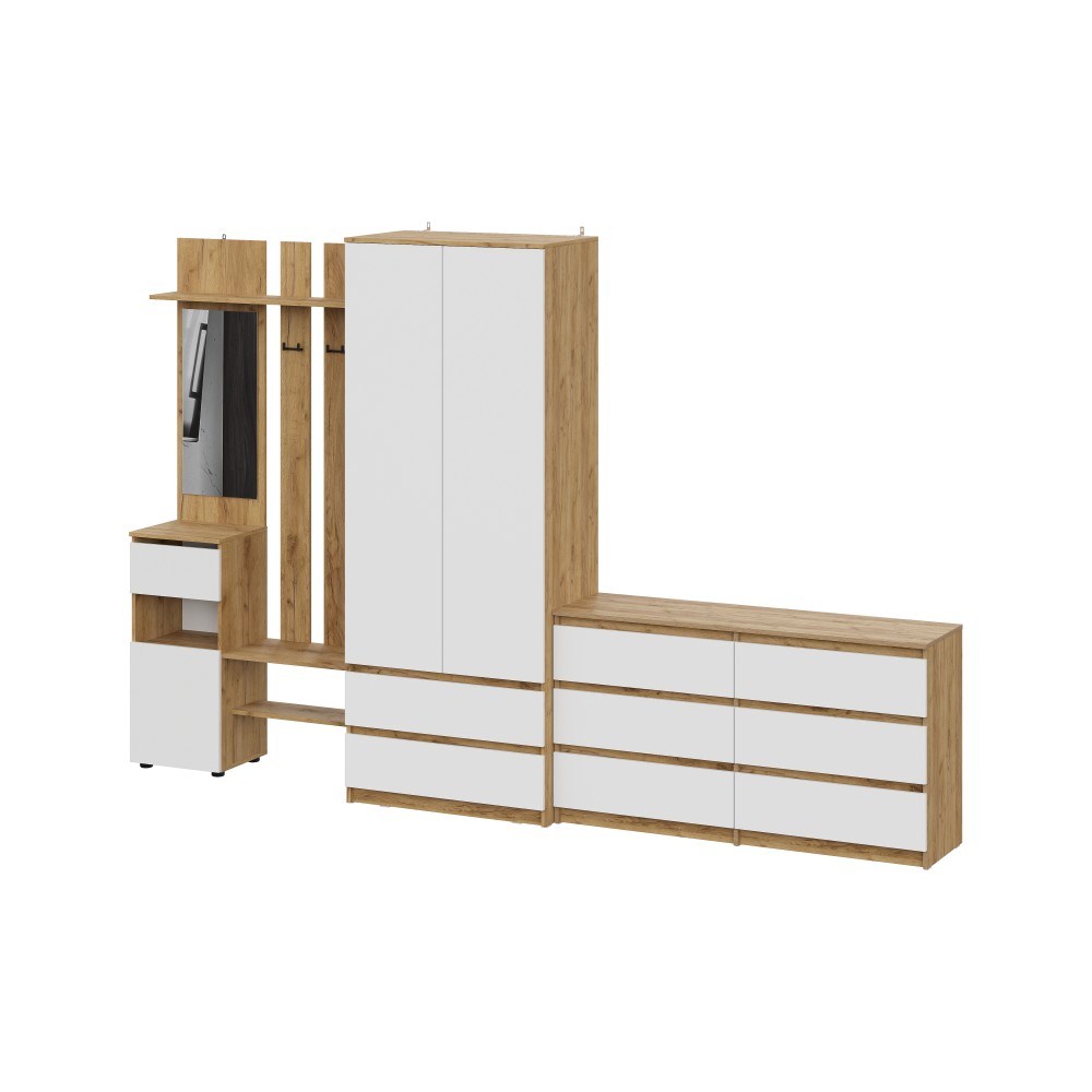 Прихожая Денвер поможет организовать систему хранения гардероба у вас дома. Для вашего удобства предусмотрены двухрожковые крючки для повседневной верхней одежды, широкая верхняя полка для головных уборов и шарфов, ниша для обуви, а также выдвижной ящик. За распашным фасадом находятся небольшие полки. Зеркало позволит оценить внешний вид перед выходом из дома. Вешалка легко крепится к стене, сборка универсальная.