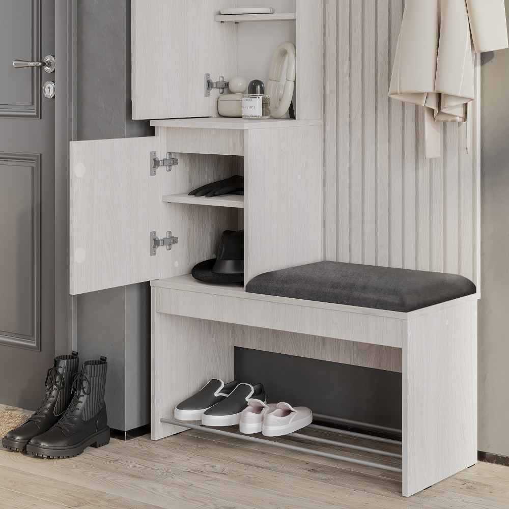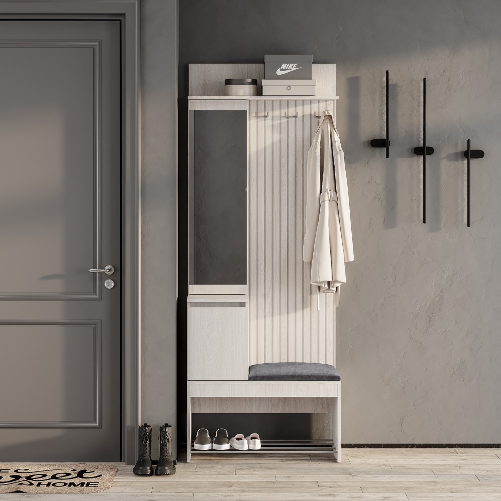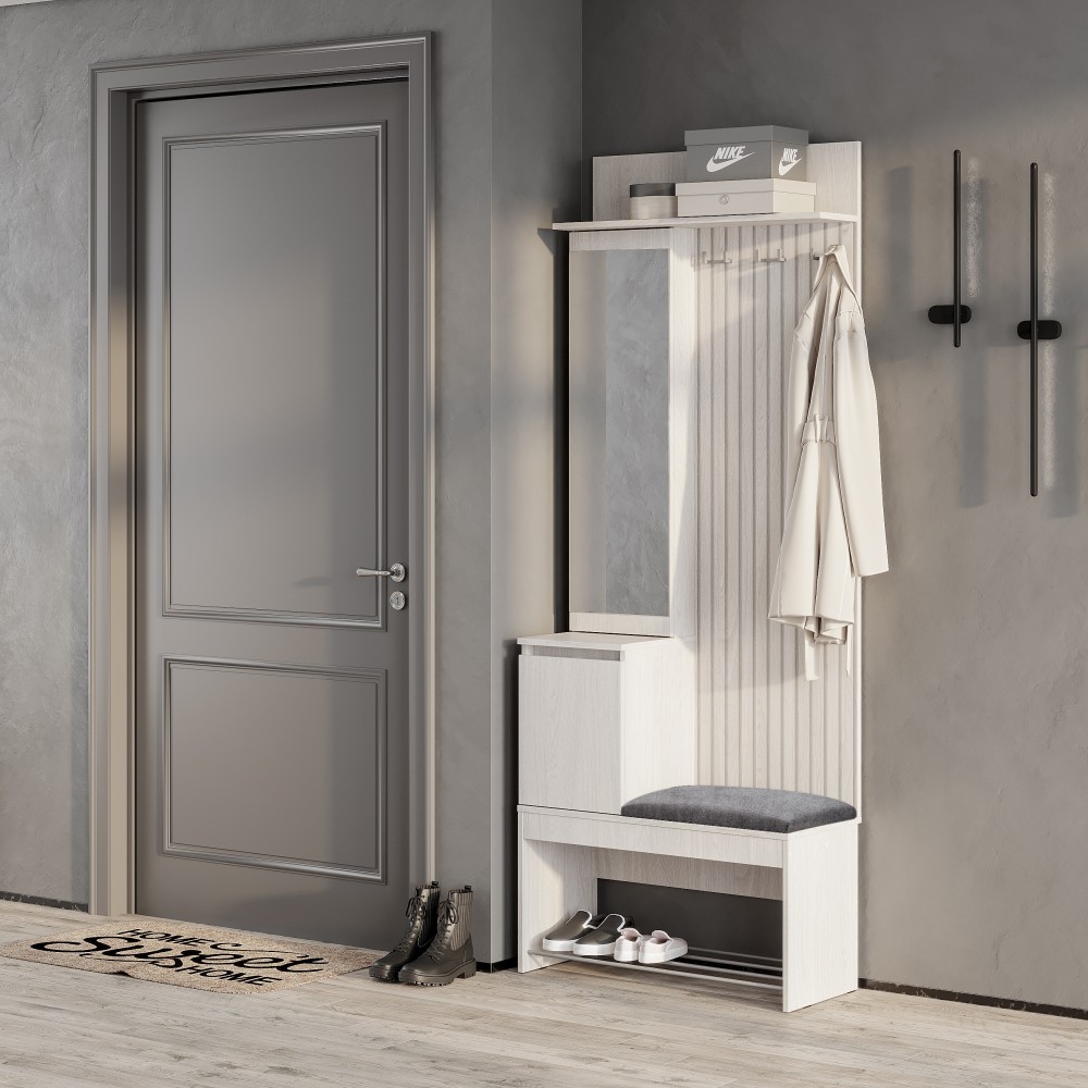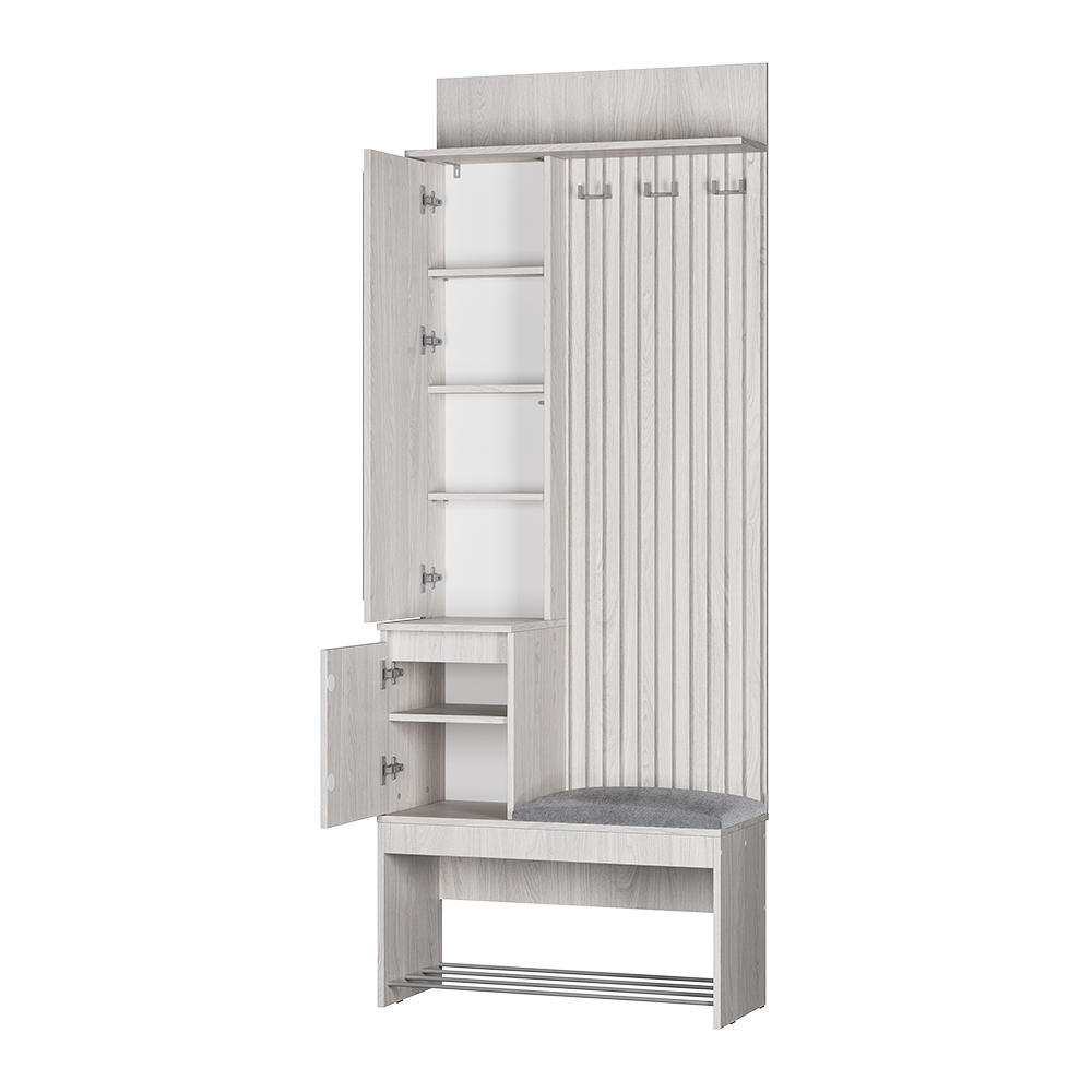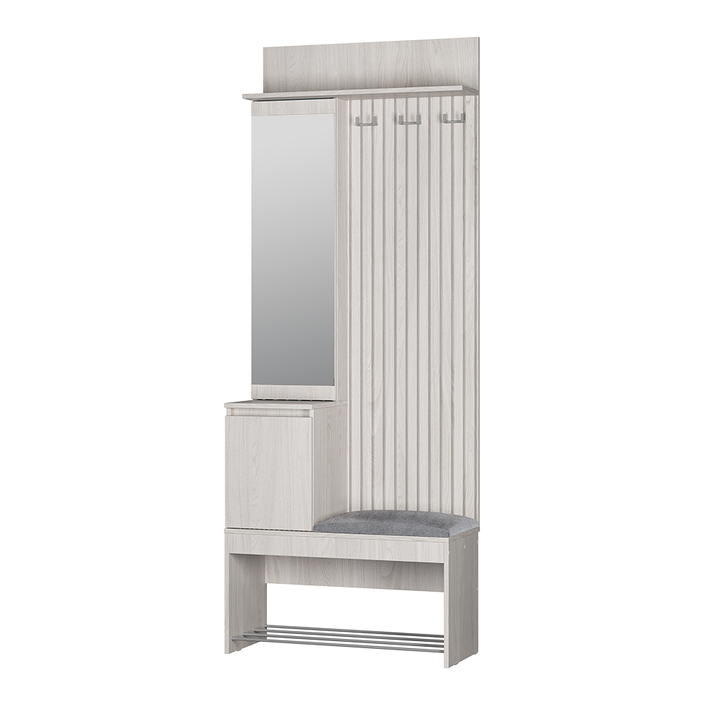Функционал прихожей «Лама» продуман до мелочей. В данной модели предусмотрены все необходимые зоны. Удобные крючки позволяют разместить повседневную одежду, не занимая при этом лишнего пространства. Горизонтальная зона из металлических труб предназначена для хранения обуви.