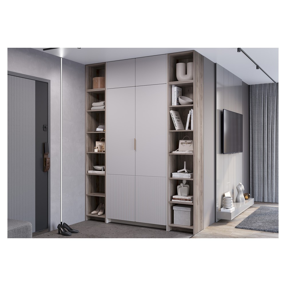 Прихожая Пандора — это универсальное решение для прихожей. Продуманное разноплановое наполнение позволит Вам разместить верхнюю одежду на плечиках на евроштанге, вещи в сложенном виде и аксессуары на полках.