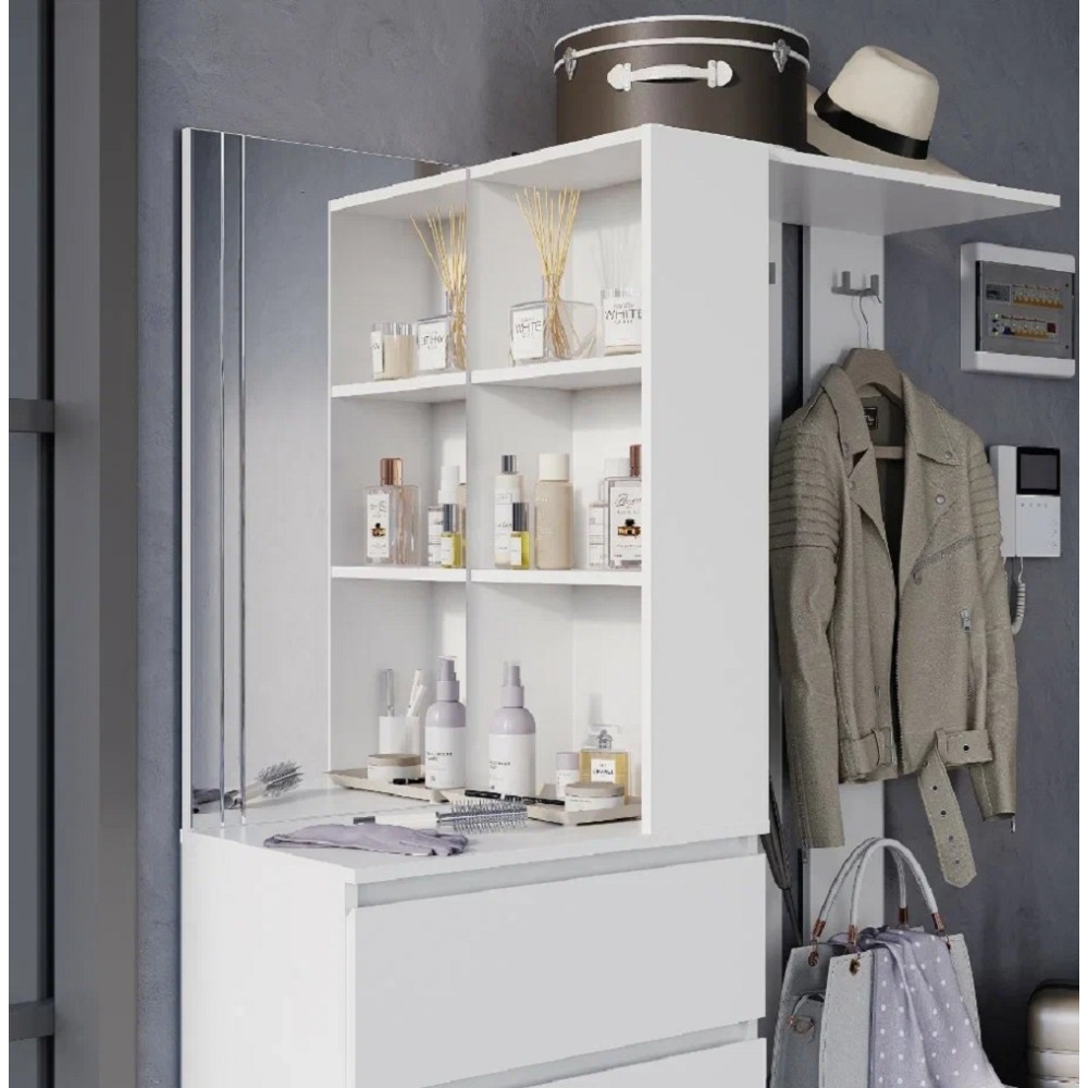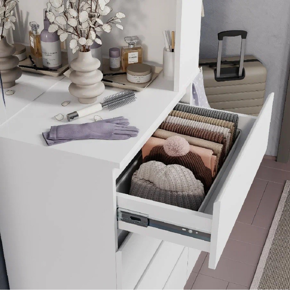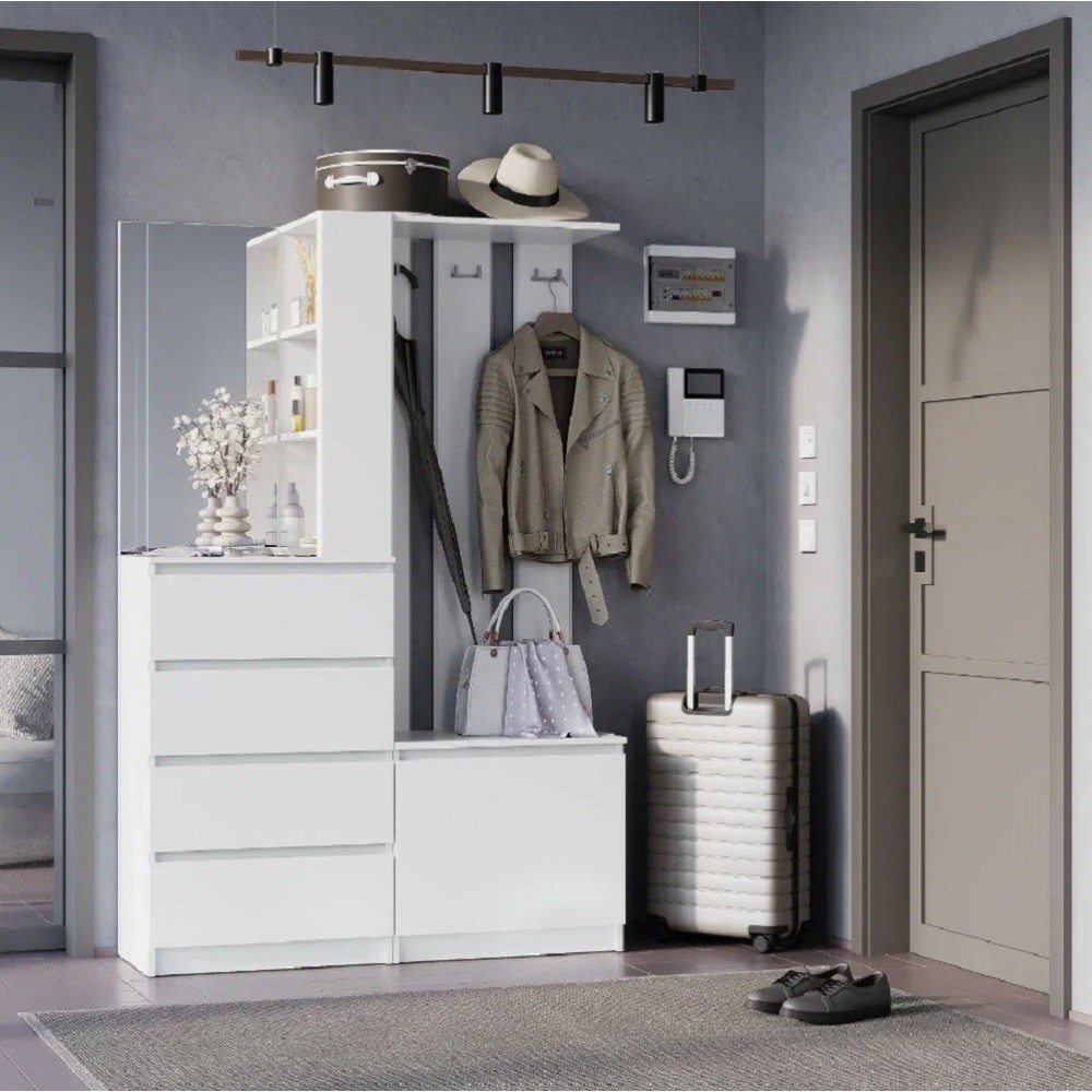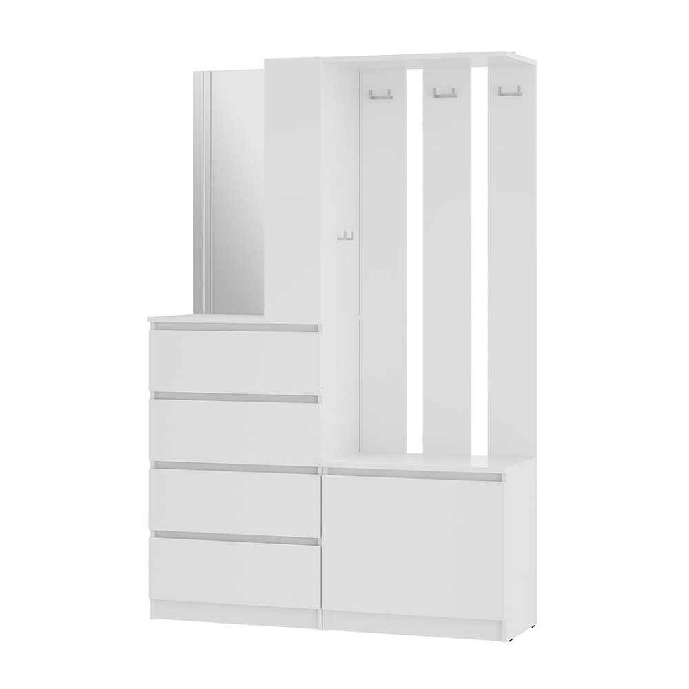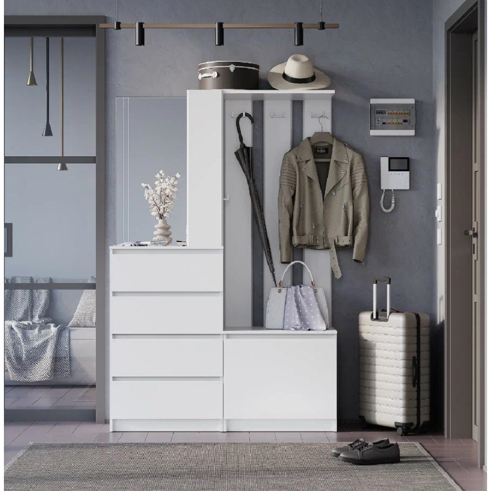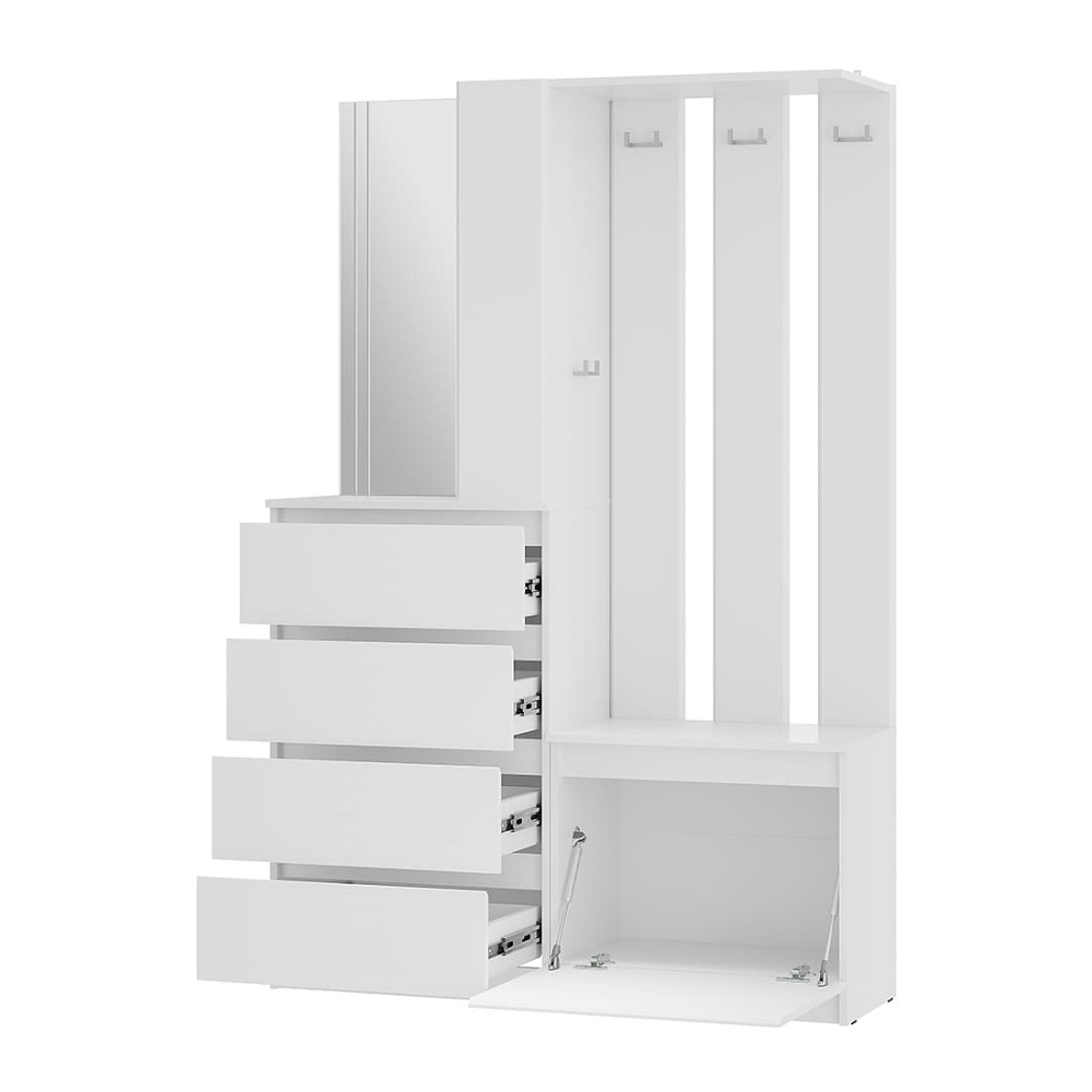 Прихожая Симпл ПР-04 - минималистичное готовое решение для современных интерьеров. Отличается практичным дизайном и максимальной функциональностью. Модуль состоит из 4-х выдвижных ящиков, тумбы с откидной створкой, зеркала, открытых полок, надежных крючков для верхней одежды и верхней полки под сезонные аксессуары.