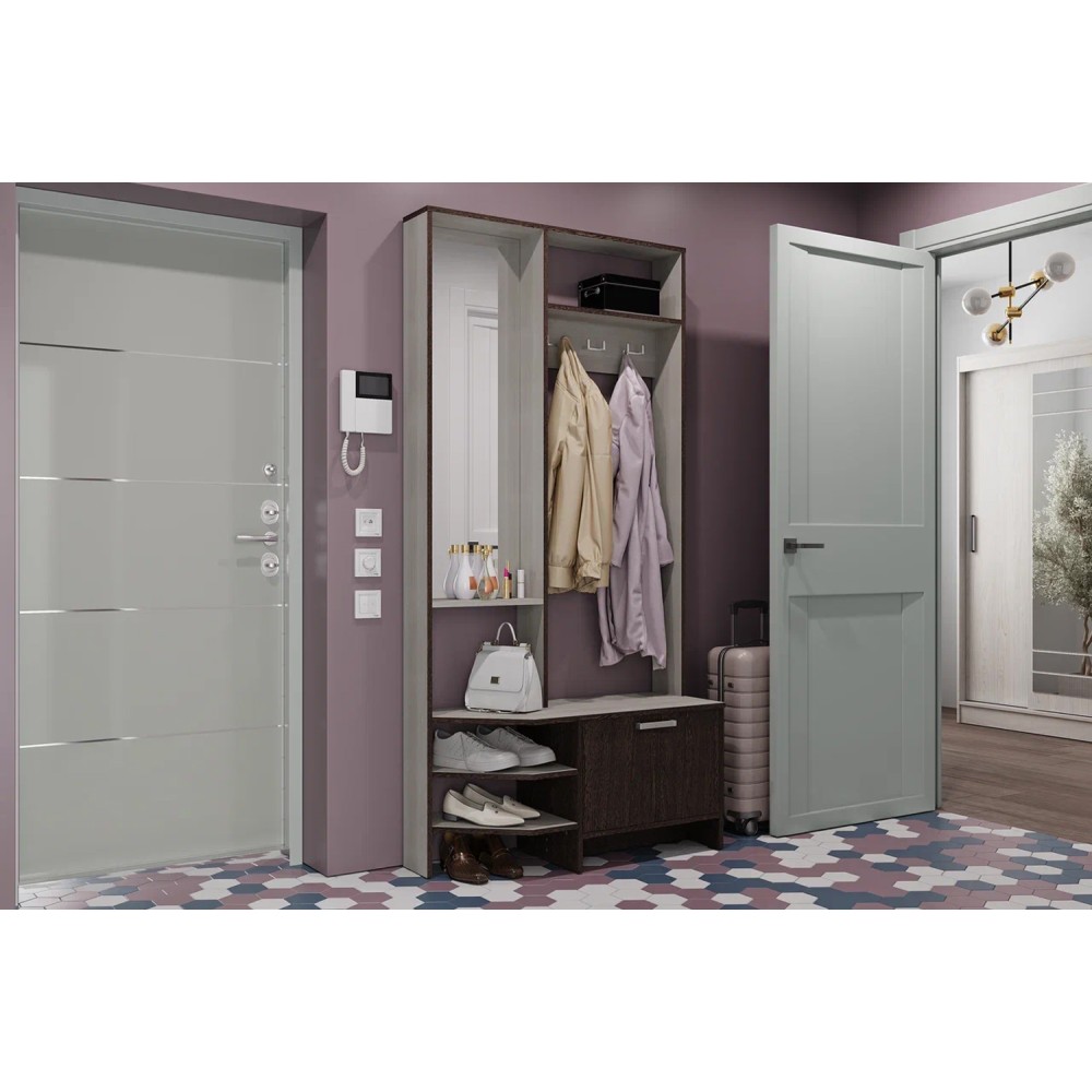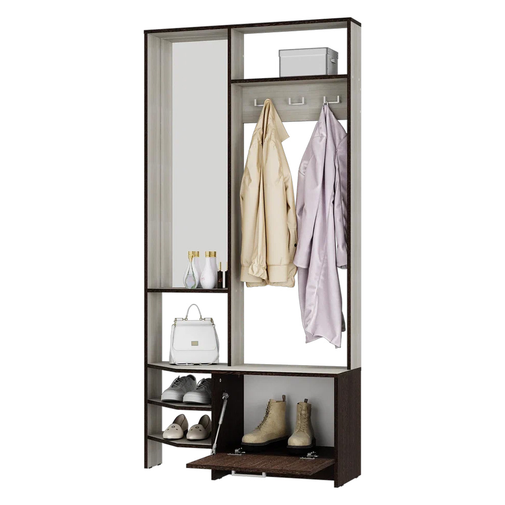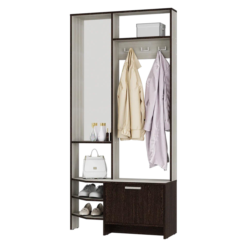 Компактная прихожая "Тео" – готовое решение для современной малогабаритной прихожей. Здесь есть все составляющие – зеркало с полкой для разных полезных мелочей, верхняя полка для головных уборов, просторная зона с крючками для верхней одежды, нижние открытые и закрытые полки, в которых можно хранить сезонную обувь. Регулируемые опоры позволяют установить прихожую на любой неровной поверхности.