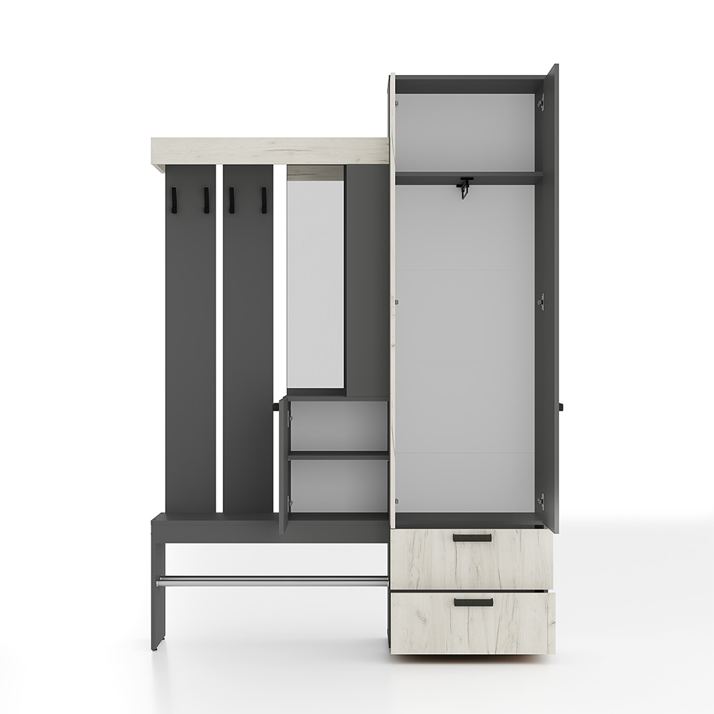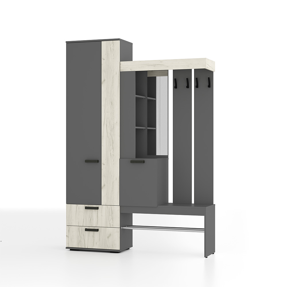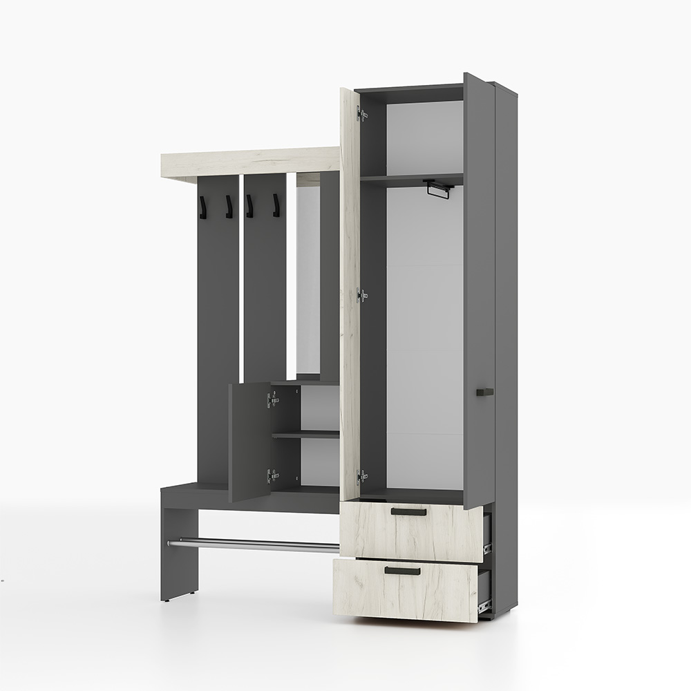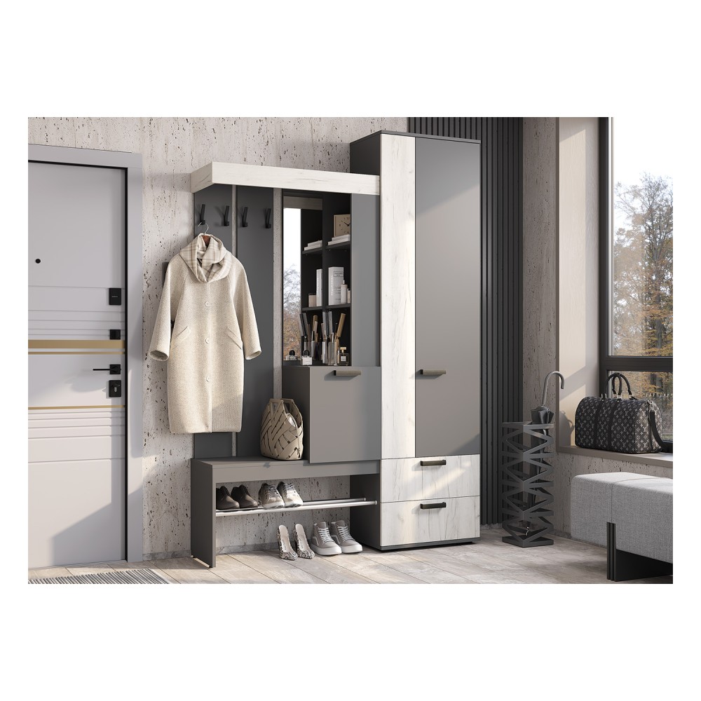 Изящная и практичная конструкция. Вместительный и компактный шкаф с отделением для верхней одежды и выдвижными ящиками. Удобная подставка под обувь (металлическая труба). Эргономичная основная секция с крючками для одежды, полками для мелочей, зеркалом и одним закрытым отделением. Контрастное исполнение в трендовых оттенках.
