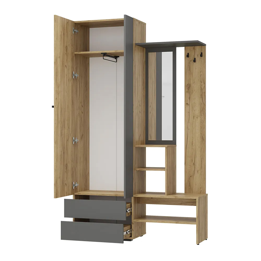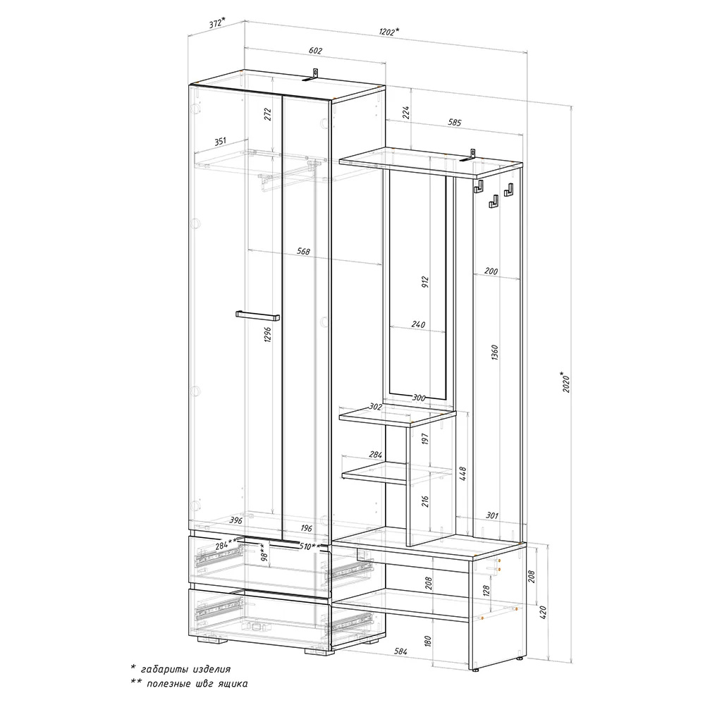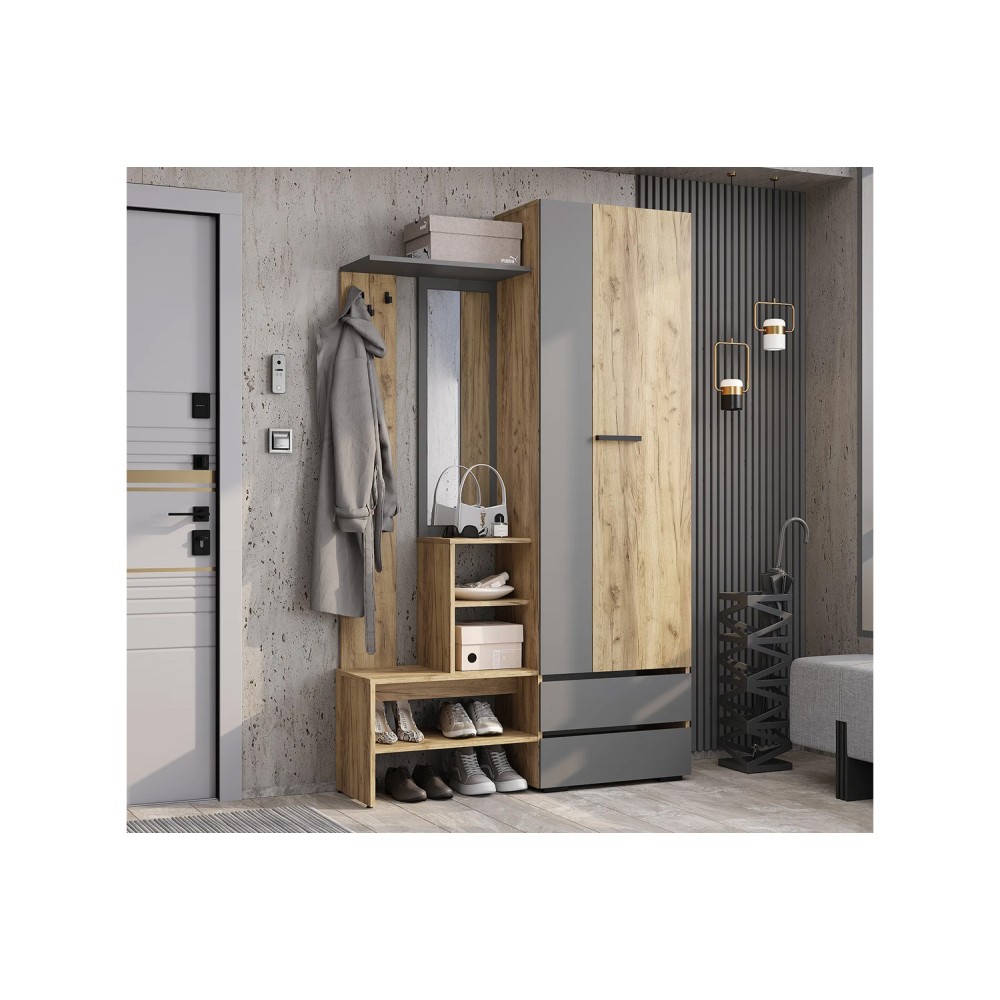 Этот стеллаж со шкафом в прихожую комнату станет отличным элементом для вашего интерьера. Мебель для дома обеспечивает удобное хранение перчаток, шапок, зонтов, сумок и других аксессуаров. Комплект включает шкаф для верхней одежды и настенную тумбу с зеркалом. Закрытые дверцами модули гарантируют порядок в коридоре.
