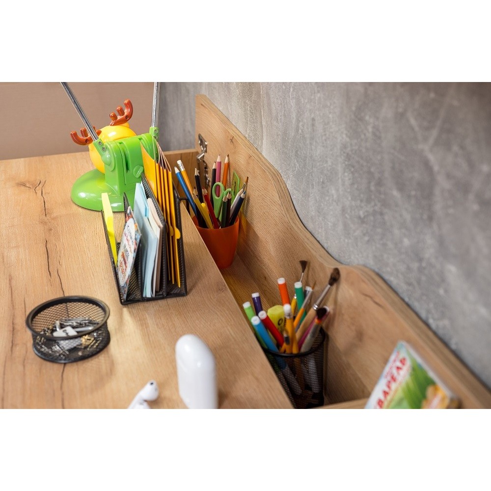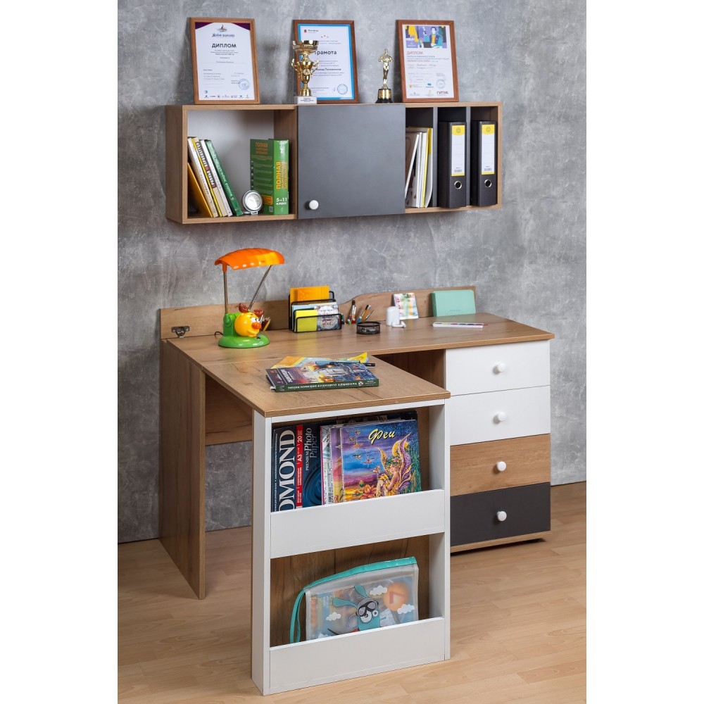 Рабочий уголок Лойс - универсальное решение для организации рабочего места для Вашего ребенка. Комплект содержит все самое необходимое для комфортной учебы и занятий творчеством. Письменный стол с 5-ю ящиками дополнен угловой пристройкой - за широкой столешницей ребенку не придется стеснять движений. В ящиках он разместит канцелярию, книги, личные вещи, предметы для творчества. В открытый карман поместятся журналы и те вещи, которые всегда должны быть под рукой. Завершит композицию навесная полка с закрытой нишей и открытыми секциями.