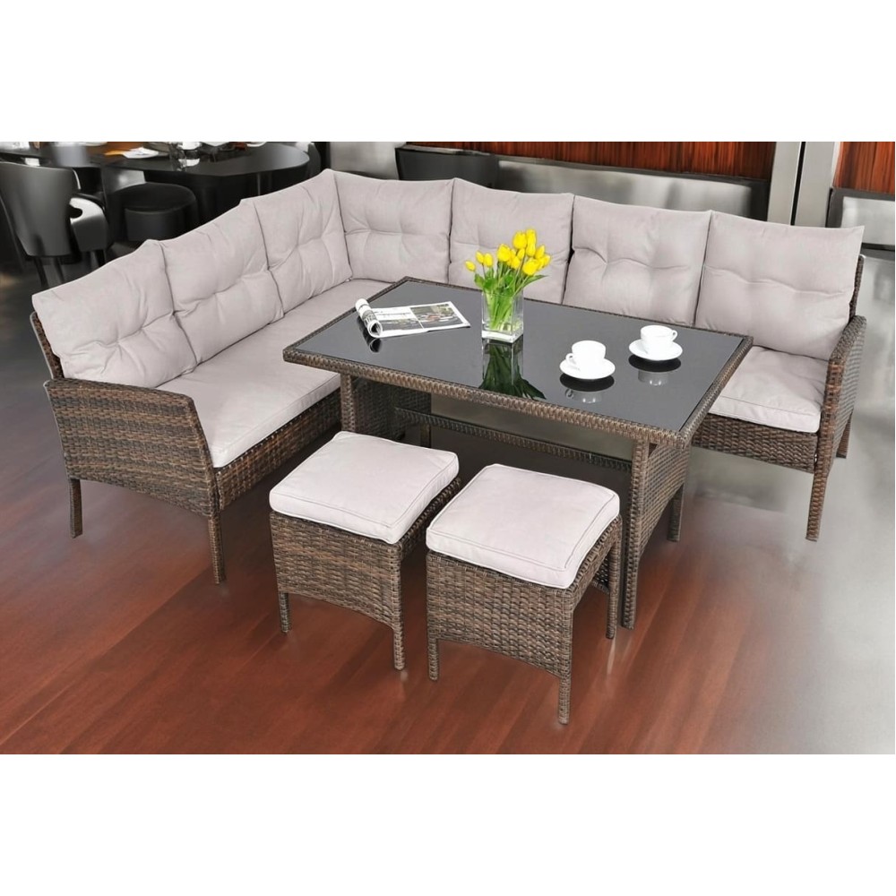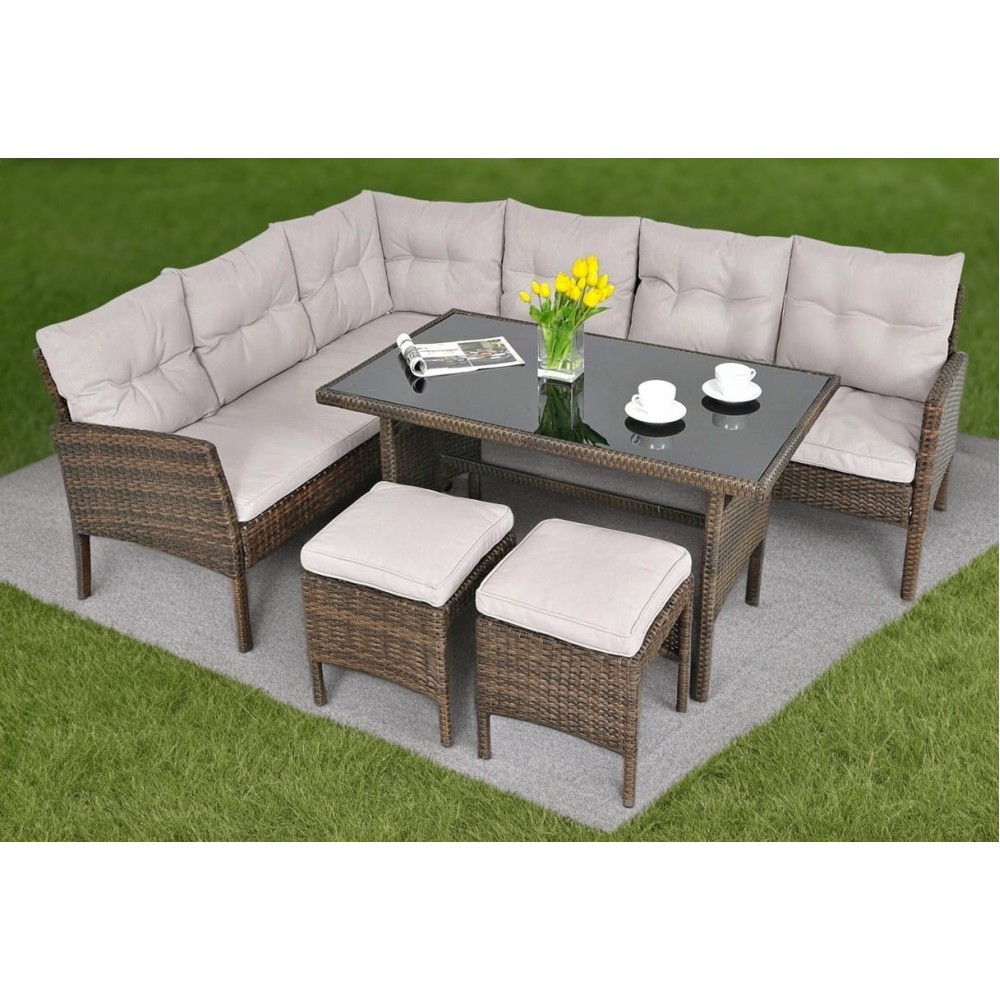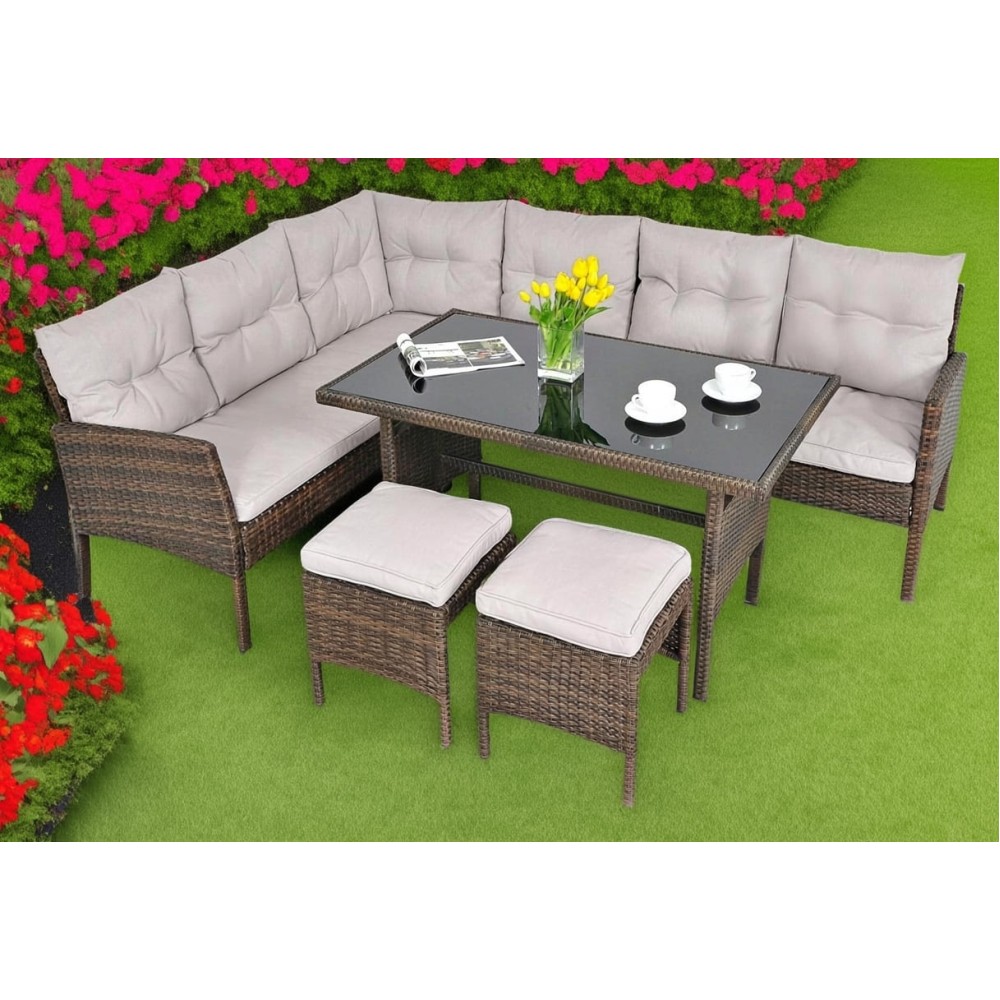 В составе комплекта: Угловой диван из двух, два пуфа и обеденный стол. Высококачественная лоза из полиротанга коричневого цвета стойкая к любым атмосферным явлениям. Крепкий стальной каркас с полимерным антивандальным покрытием и отличным качеством сварки. Изделие сплетено вручную нашими мастерами под жестким контролем качества на каждом этапе производства. Лоза максимально приближена по рельефу и текстуре к естественному материалу. Идеально подходит для использования на улице и внутри помещения в любую погоду. Не боится воды, солнца и минусовой температуры.