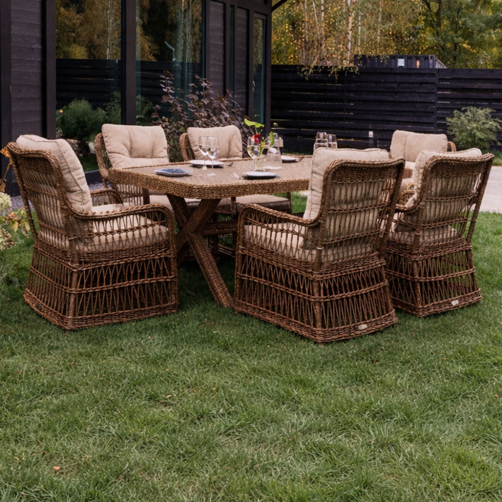 Комплект садовой мебели Isabella станет удачным решением для обустройства придомовой террасы или летней беседки, а также просторной гостиной комнаты или столовой. Его габаритов вполне достаточно не только для ежедневных семейных трапез, но и праздничных застолий с самыми близкими друзьями. Обеденный гарнитур выполнен в легком традиционном дизайне с использованием естественных оттенков, что позволяет ему гармонично вписываться любое окружение.