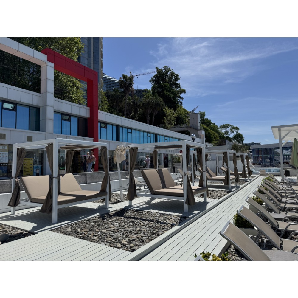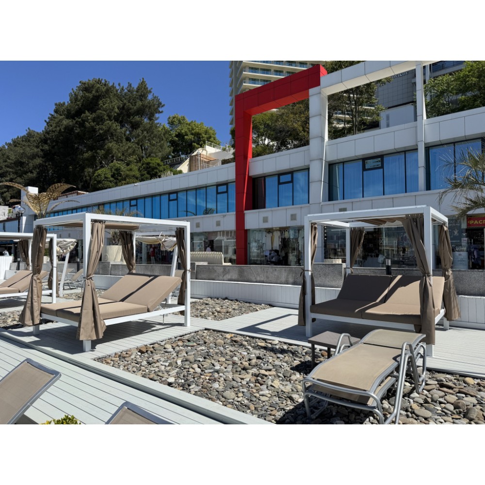 Просторный шатер с лежаками Enigma имеет современный дизайн и прекрасно дополнит зону отдыха. Основная конструкция шатра изготовлена из алюминия и покрыта порошковой краской. Крыша и боковые шторы выполнены из полиэстера и обеспечивают приятную тень от солнца и возможность создать атмосферу уединения.. Зона лежаков разделена на две части, спинки можно регулировать независимо друг от друга. Высота спинки регулируется в четырех положениях. Мягкие матрасы с чехлами из полиэстера обеспечивают настоящий комфорт. Изделие устойчиво к переменчивым погодным условиям и очень простое в уходе. Только подушки, крыша и шторы нуждаются в защите от непогоды. Особенности модели: Каркас выполнен из алюминия с порошковым покрытием. Толщина столбов: 0.9 мм. Толщина металла: 0.9/1.0/1.2 мм Спинки лежаков регулируются в 4 положениях. Чехлы матрасов выполнены из полиэстера 180 г/м², цвет: 9928. Толщина матраса: 100 мм. Шторы выполнены из полиэстера 180 г/м², цвет: 9928. Размеры штор: ширина левой и правой штор: около 1830 мм; ширина передней и задней штор: около 2040 мм; высота: 1760 мм. Предупреждение: не допускайте скопления дождевой воды на крыше. В конце летнего сезона садовый шатер рекомендуется разобрать и хранить в сухом и хорошо проветриваемом помещении. Открыть инструкцию.