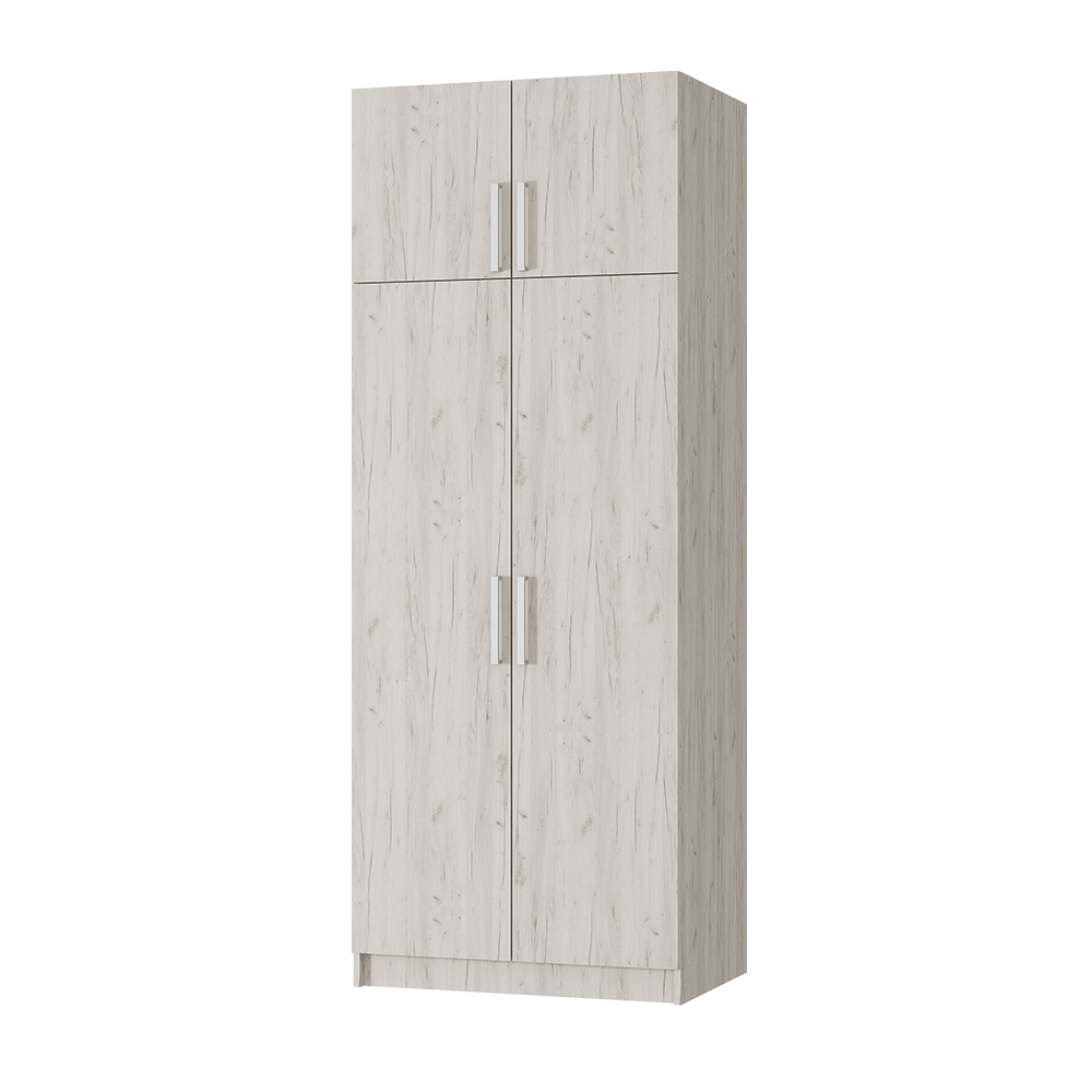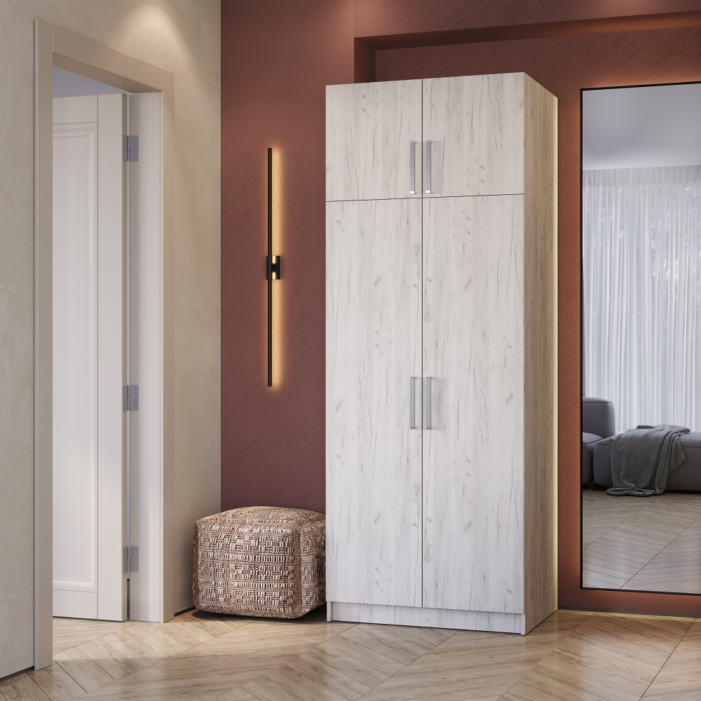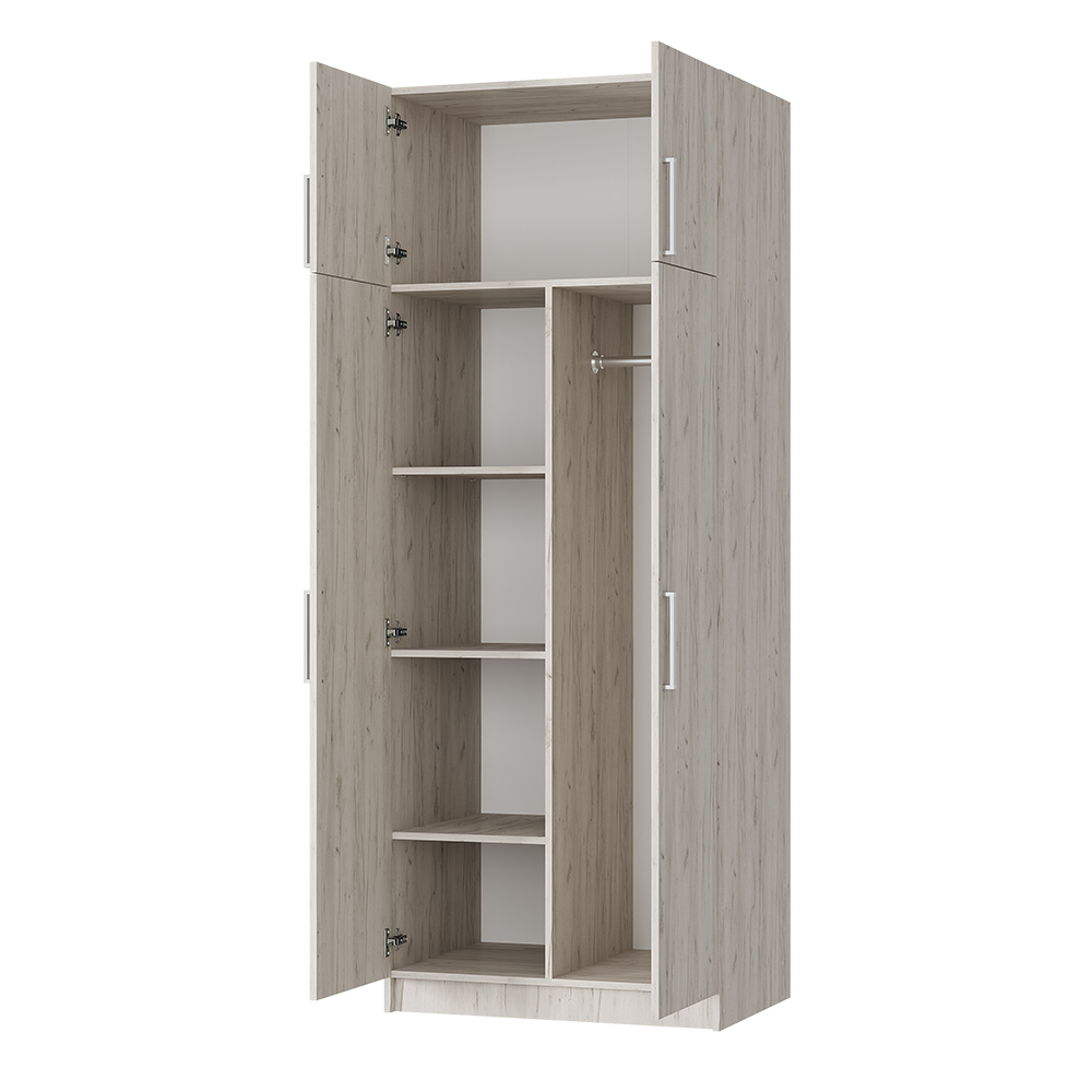 Функциональный двухстворчатый шкаф справится с размещением большого количества предметов одежды и аксессуаров. Модель разделена на две зоны, каждая из которых оснащена распашными дверцами, в большей части находятся полки и отделение с хромированной штангой. Часть поменьше представляет собой вместительную нишу для хранения.