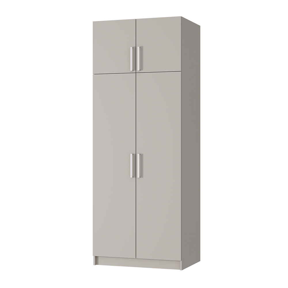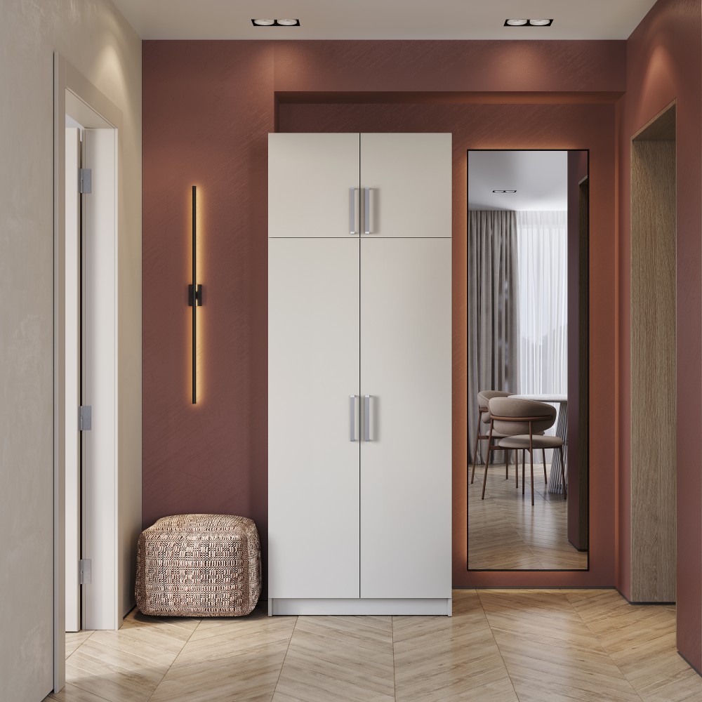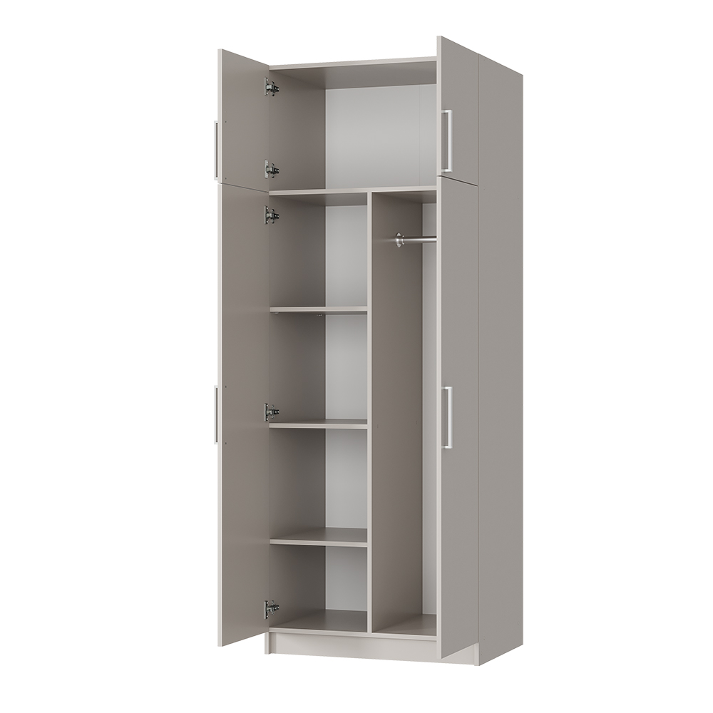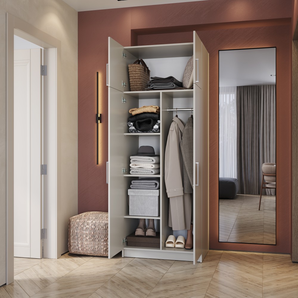 Функциональный двухстворчатый шкаф справится с размещением большого количества предметов одежды и аксессуаров. Модель разделена на две зоны, каждая из которых оснащена распашными дверцами, в большей части находятся полки и отделение с хромированной штангой. Часть поменьше представляет собой вместительную нишу для хранения.