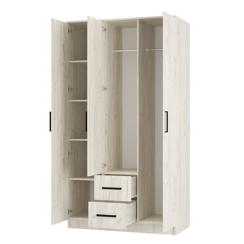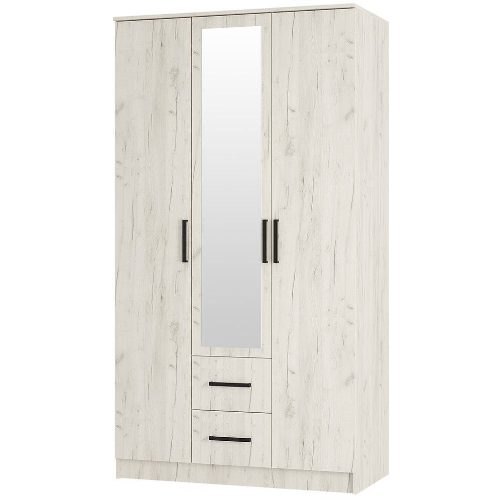 Красивая классическая модель трёхстворчатого шкафа Фиеста прекрасно впишется в интерьер спальни или гостиной. Центральная створка у модели – зеркальная, под ней находятся два выкатных ящика. Шкаф состоит из отделений с хромированными штангами и зоны с полками для хранения трикотажа или белья.