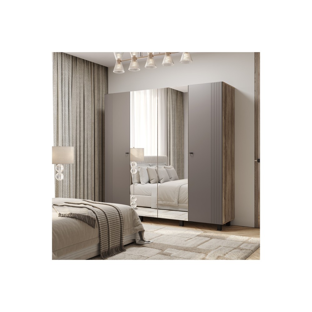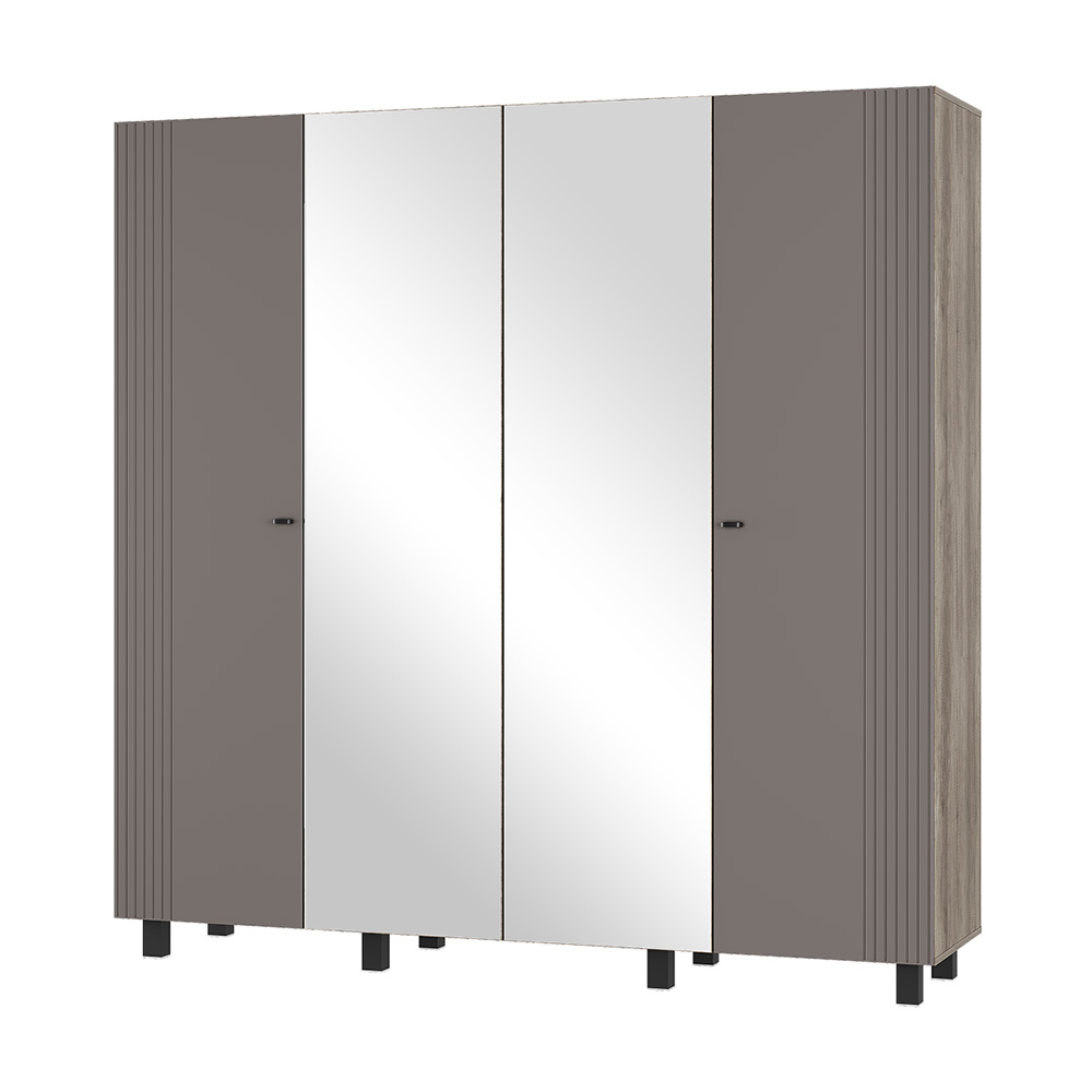 Шкаф 4-х створчатый Олива ШК-08 — это элегантное и функциональное решение для любого интерьера. Коллекция представлена в тренировках пудровых оттенках. Фрезеровка на фасадах создает интересные текстурные контрасты и визуальные акценты. Кроме того, этот элемент декора также помогает скрыть мелкие загрязнения, что упрощает уход за мебелью. Черные металлические накладные ручки и петли с доводчиками обеспечивают удобство в использовании.