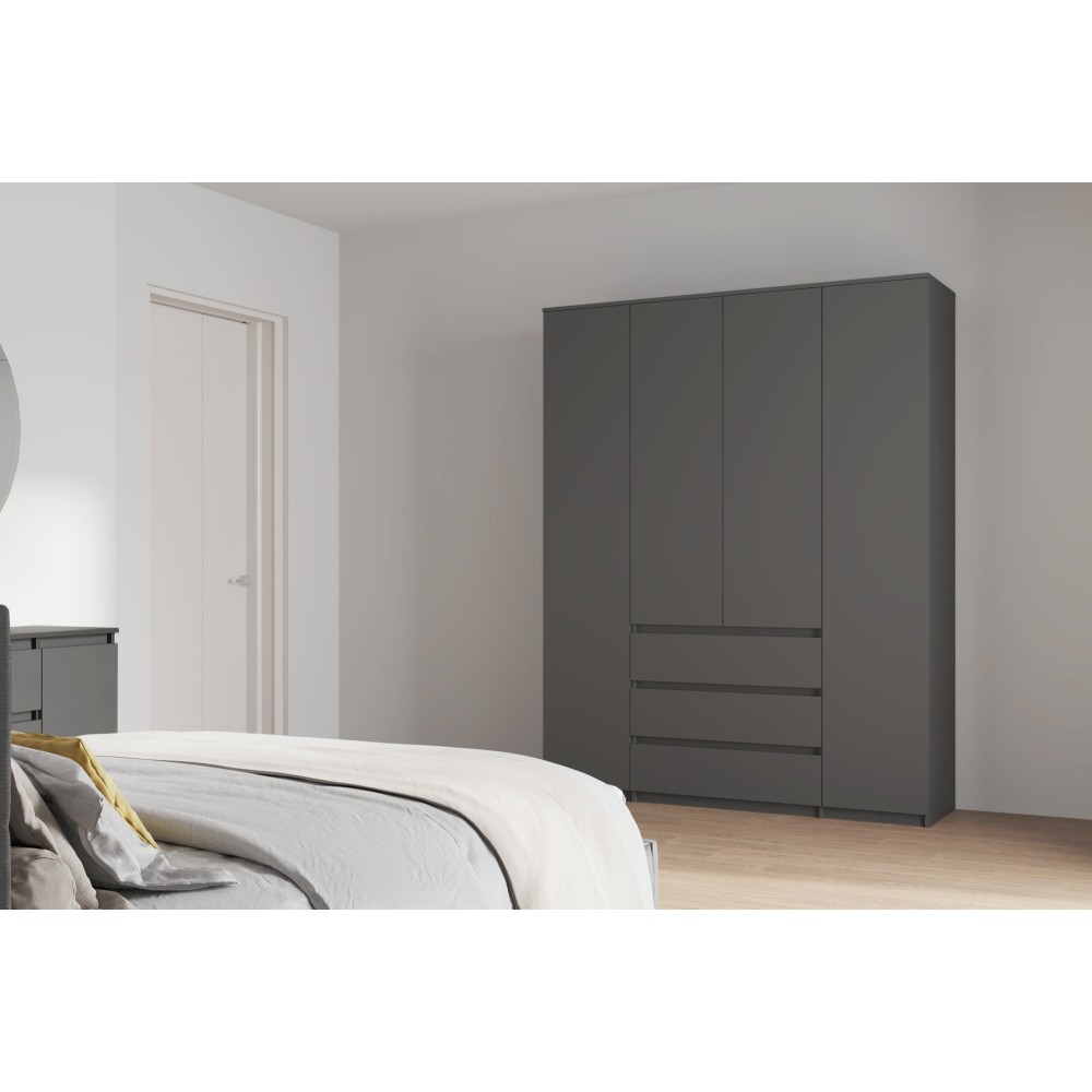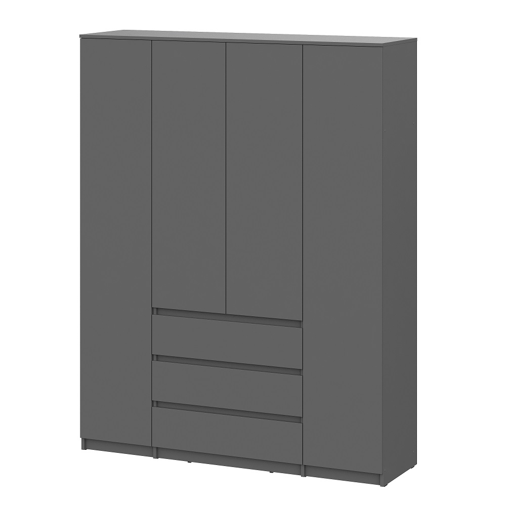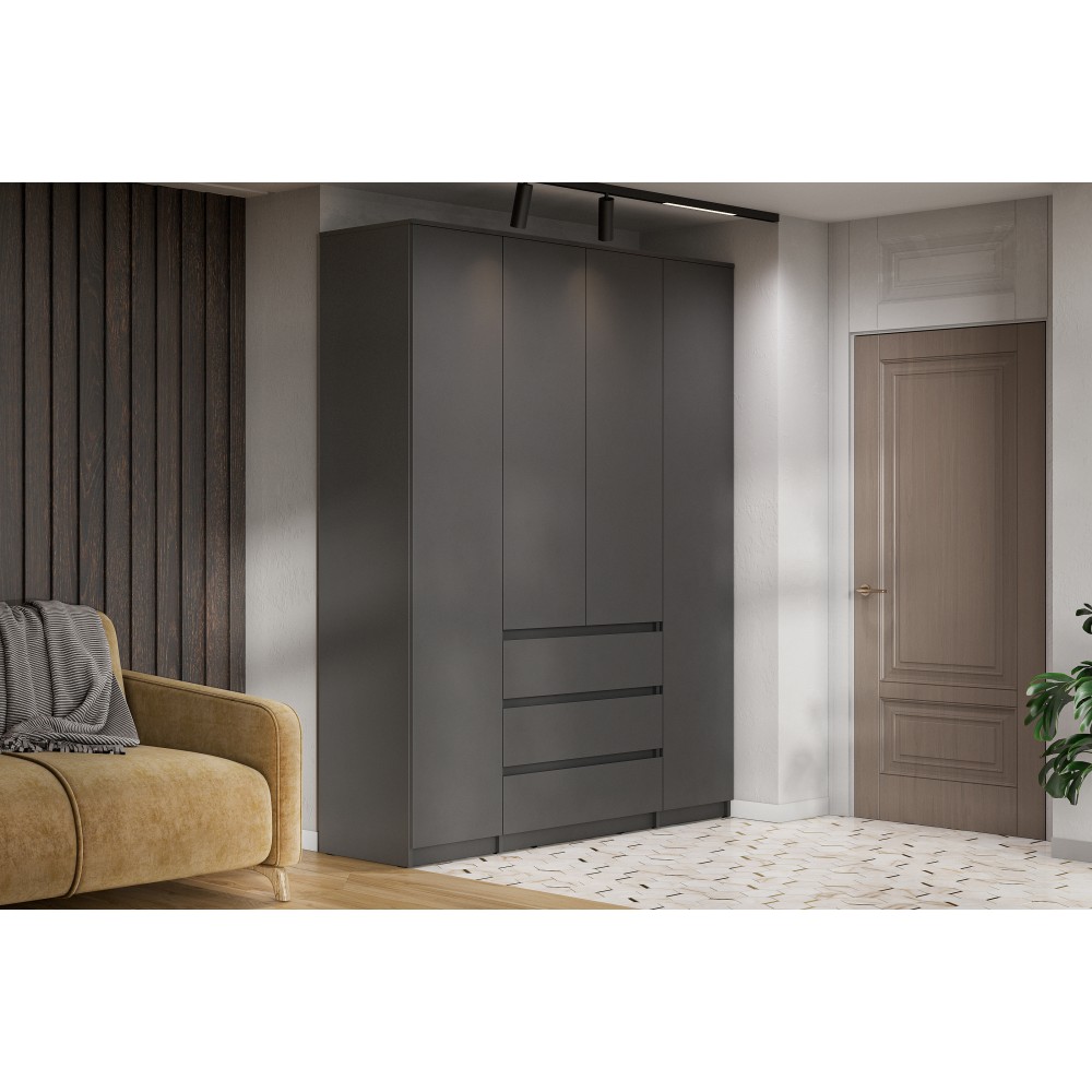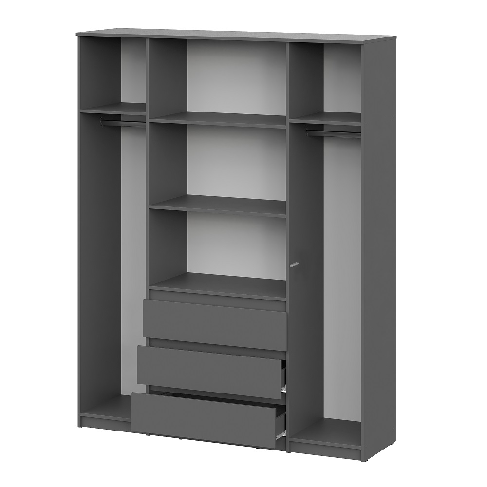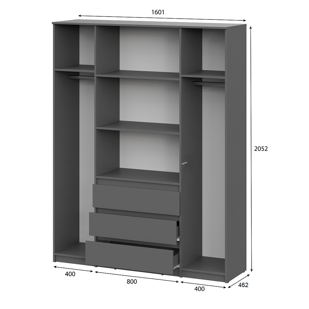 Вместительный распашной шкаф Денвер в цвете графит серый – это идеальное место хранения. Главное преимущество этого шкафа для одежды - его размер и наличие трех выдвижных ящиков. В нем вы сможете найти место для каждой вещи - от платьев до курток, от белья до обуви. Благодаря широким отделениям, вы сможете легко разделить вашу одежду по категориям и поддерживать порядок внутри. Распашные двери обеспечивают удобный доступ к вашей одежде. Три выдвижных ящика помогут легко и быстро найти нужное. Шкаф Денвер оснащен пятью вместительными полками и двумя штангами для одежды, обеспечивая сохранность и презентабельность Ваших вещей. Двери открываются с помощью нажатия.