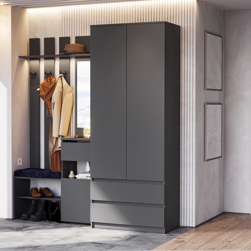Шкаф Денвер с распашными дверьми и двумя ящиками в цвете графит - это идеальный выбор для тех, кто ищет стильную и функциональную мебель для своего дома. За распашными дверцами скрыты полки и штанга для одежды. Шкаф имеет два выдвижных вместительных ящика для хранения необходимых вещей. Цвет дуб золотой/белый выглядит стильно и практично, а благодаря своей универсальности, он подойдет для любого современного интерьера.
