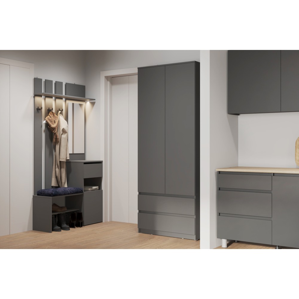 Шкаф Денвер с распашными дверьми и двумя ящиками в цвете графит - это идеальный выбор для тех, кто ищет стильную и функциональную мебель для своего дома. За распашными дверцами скрыты полки и штанга для одежды. Шкаф имеет два выдвижных вместительных ящика для хранения необходимых вещей. Цвет дуб золотой/белый выглядит стильно и практично, а благодаря своей универсальности, он подойдет для любого современного интерьера.