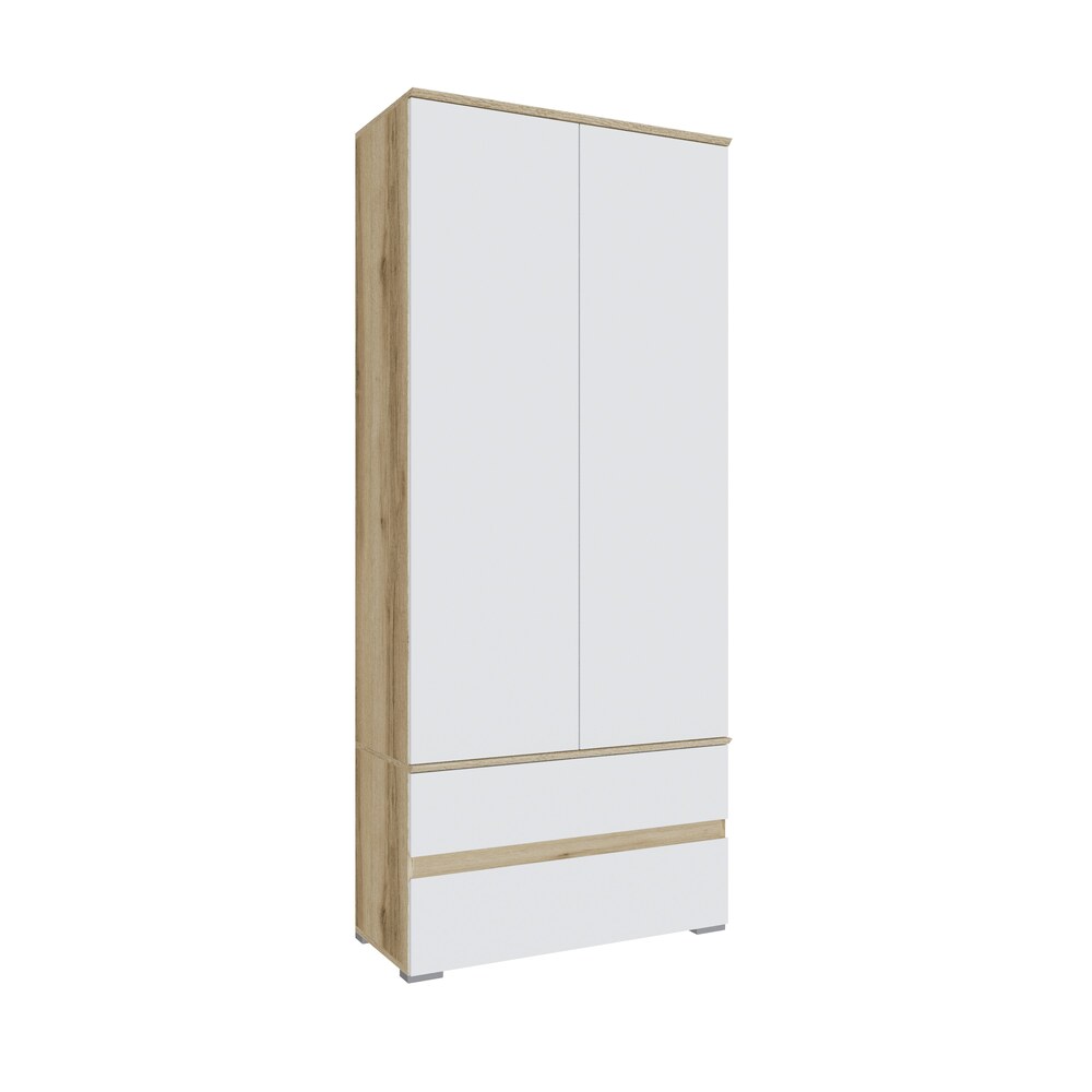 В поисках внместительного белого шкафа со стандартными габаритами рекомендуем присмотреться к модели из серии Плейона. Двухстворчатый шкаф оснащен выдвижной евроштангой, комплектом полок и двумя выдвижными ящиками.