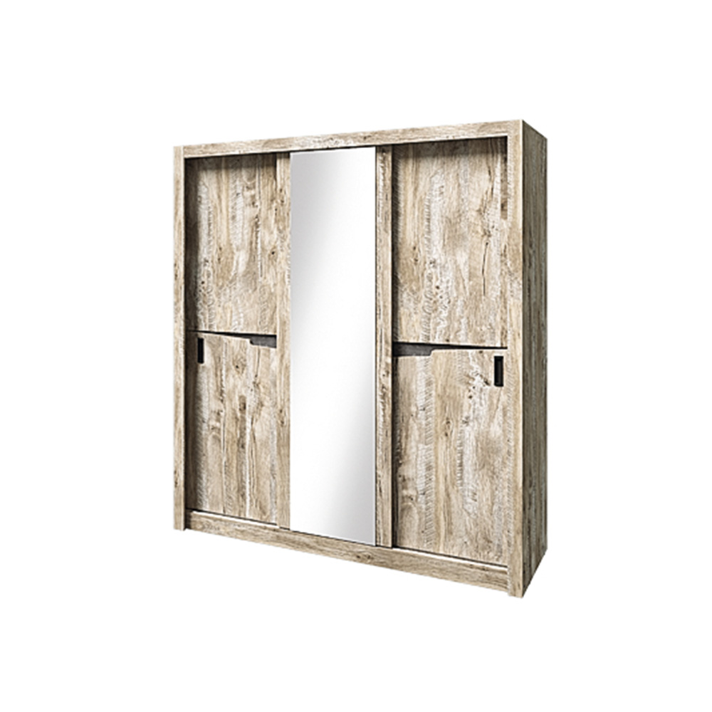 Удобные раздвижные двери предоставляют доступ к вместительной платяной секции с металлической штангой для вешалок с одеждой и боковой пенальной секции с пятью полками, расположенными одна над другой.
