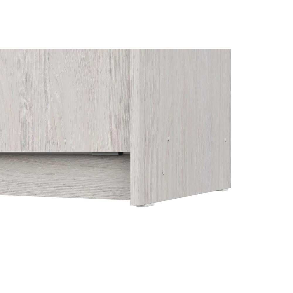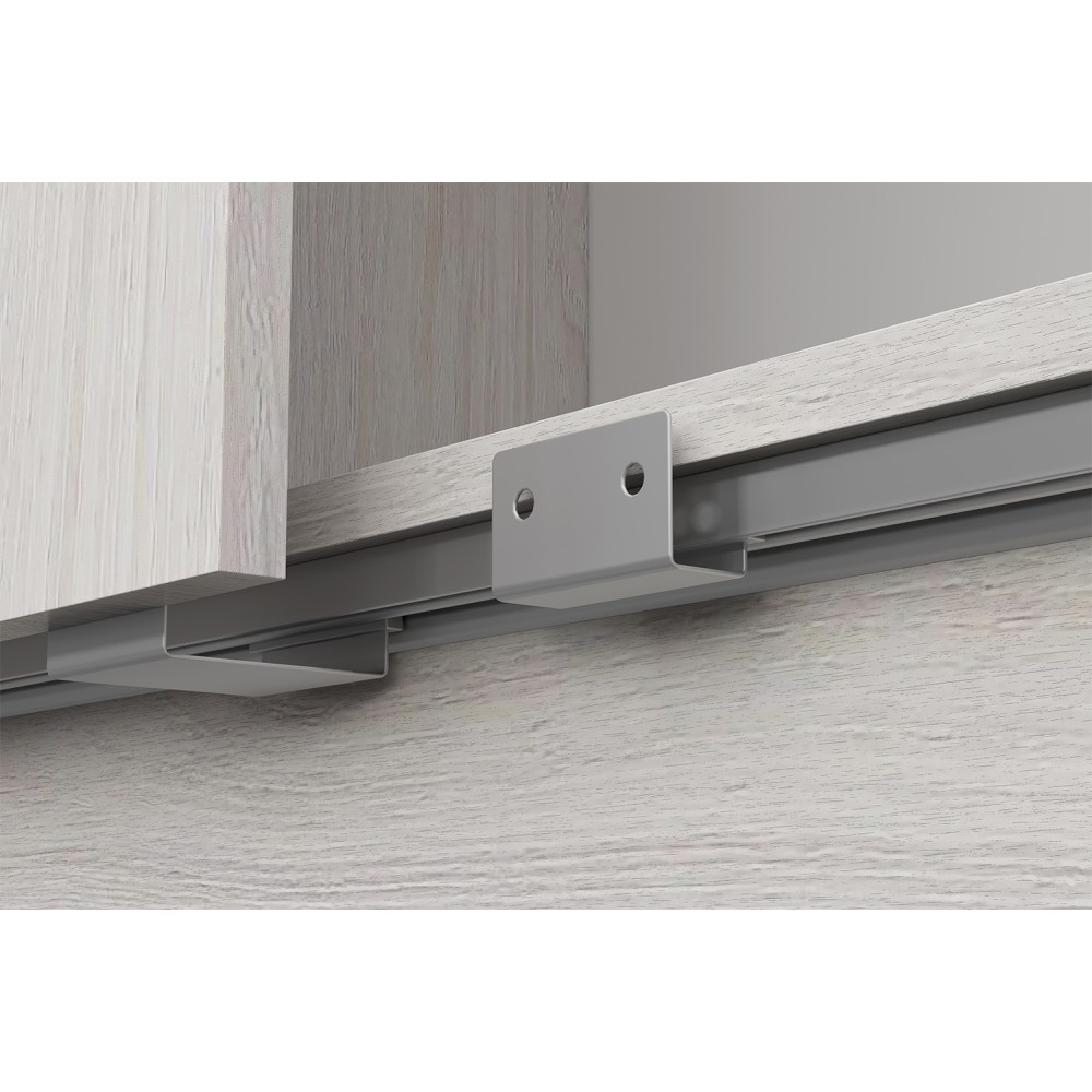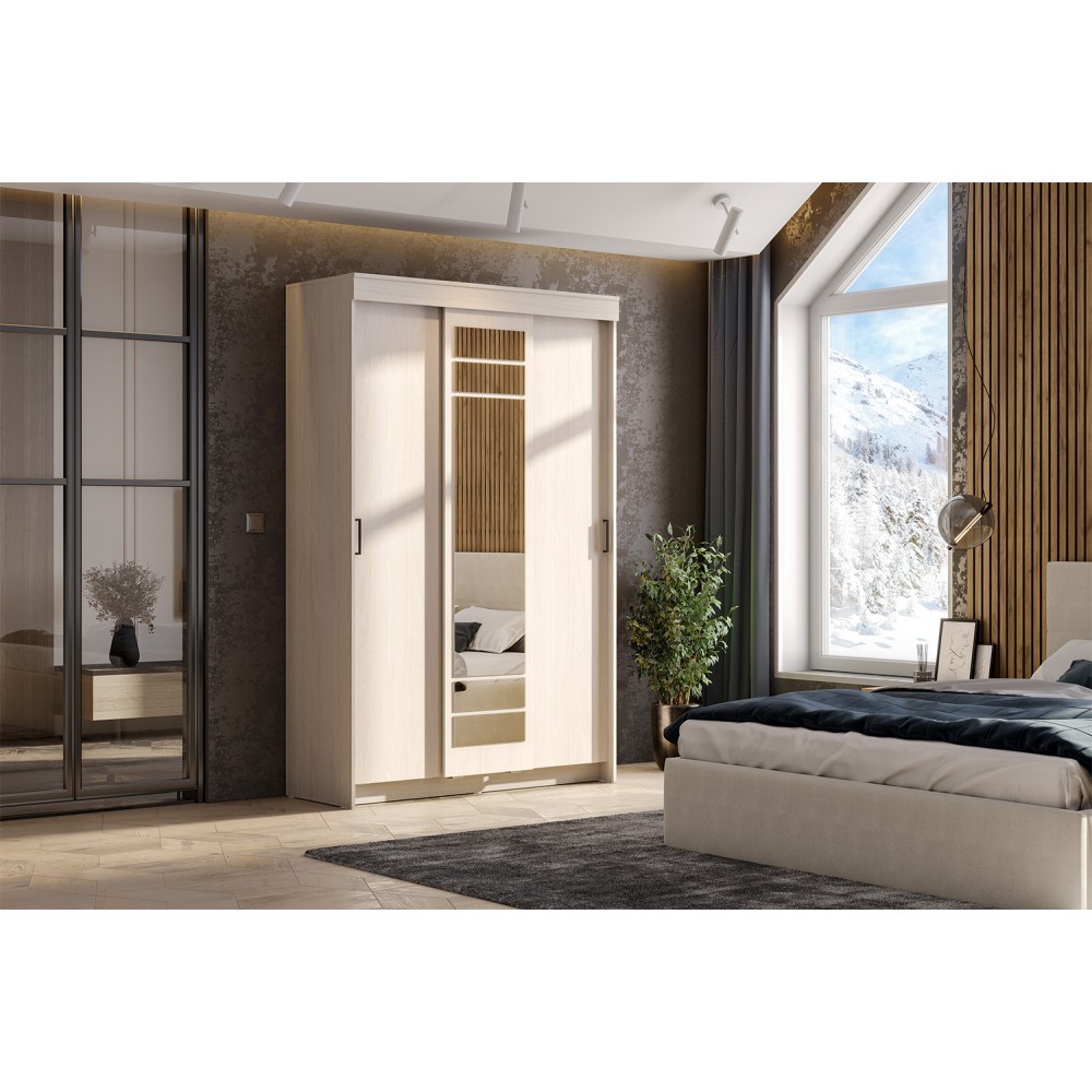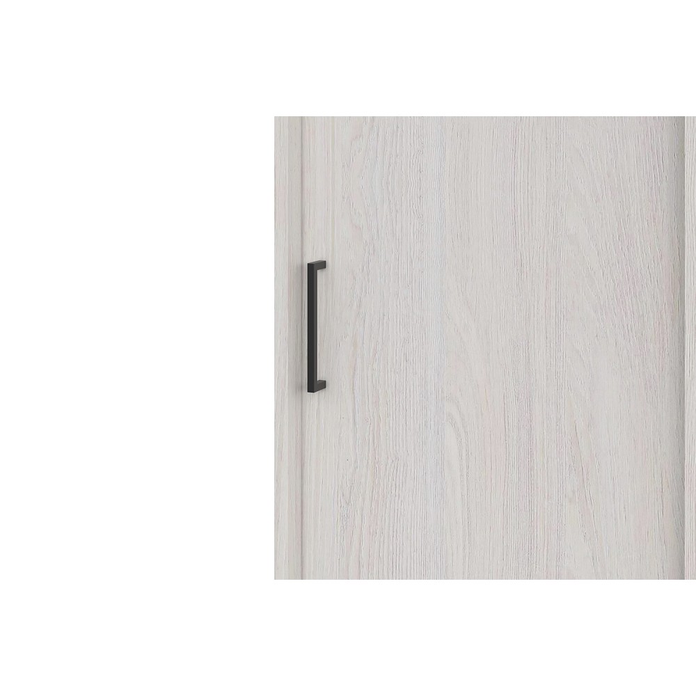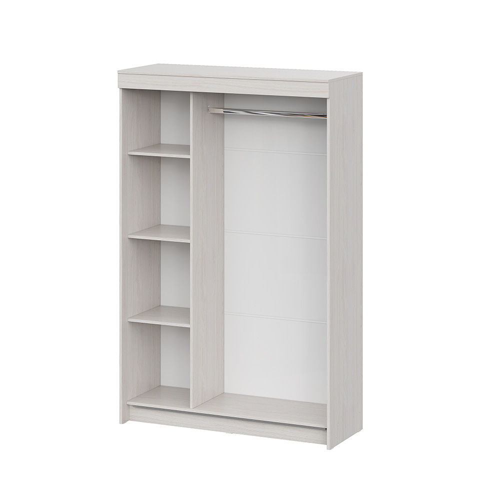 Удобные раздвижные двери предоставляют доступ к вместительной платяной секции с металлической штангой для вешалок с одеждой и боковой пенальной секции с пятью полками, расположенными одна над другой.