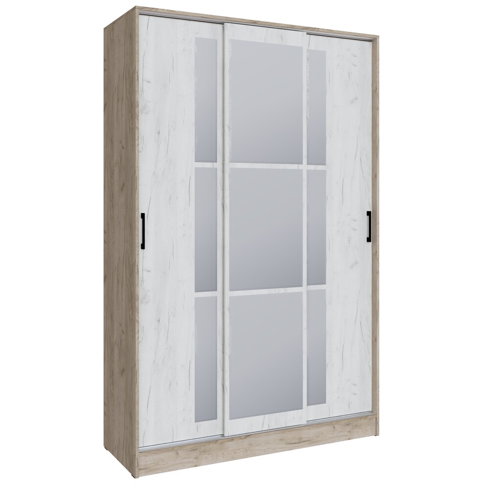 Удобные раздвижные двери предоставляют доступ к вместительной платяной секции с металлической штангой для вешалок с одеждой и боковой пенальной секции с пятью полками, расположенными одна над другой.