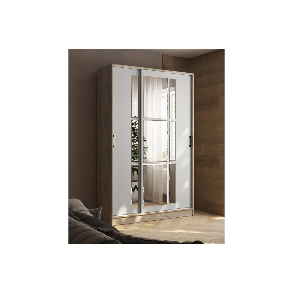 Удобные раздвижные двери предоставляют доступ к вместительной платяной секции с металлической штангой для вешалок с одеждой и боковой пенальной секции с пятью полками, расположенными одна над другой.