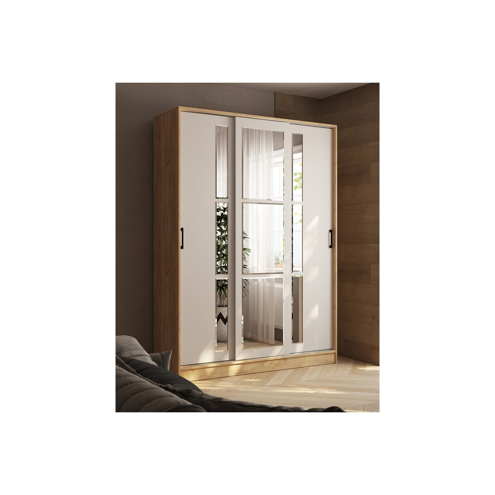 Удобные раздвижные двери предоставляют доступ к вместительной платяной секции с металлической штангой для вешалок с одеждой и боковой пенальной секции с пятью полками, расположенными одна над другой.