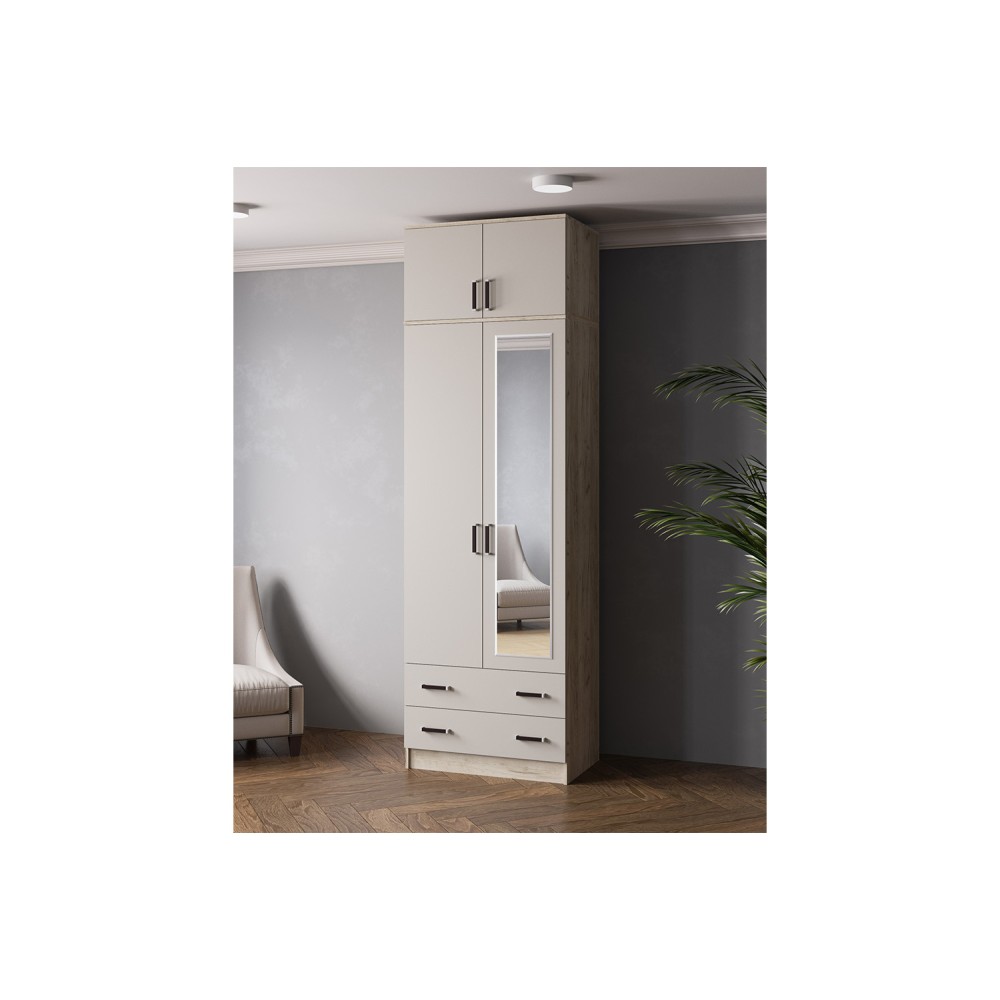 Комбинированный шкаф Лагуна с зеркалом и антресолью впишется в любую обстановку, от современного интерьера прихожей до миниматистичной спальни. Зеркальная дверь поможет визуально расширить пространство и наполнить его светом. Шкаф оснащен выдвижными ящиками, штангой для одежды и полкой для вещей в коробках.