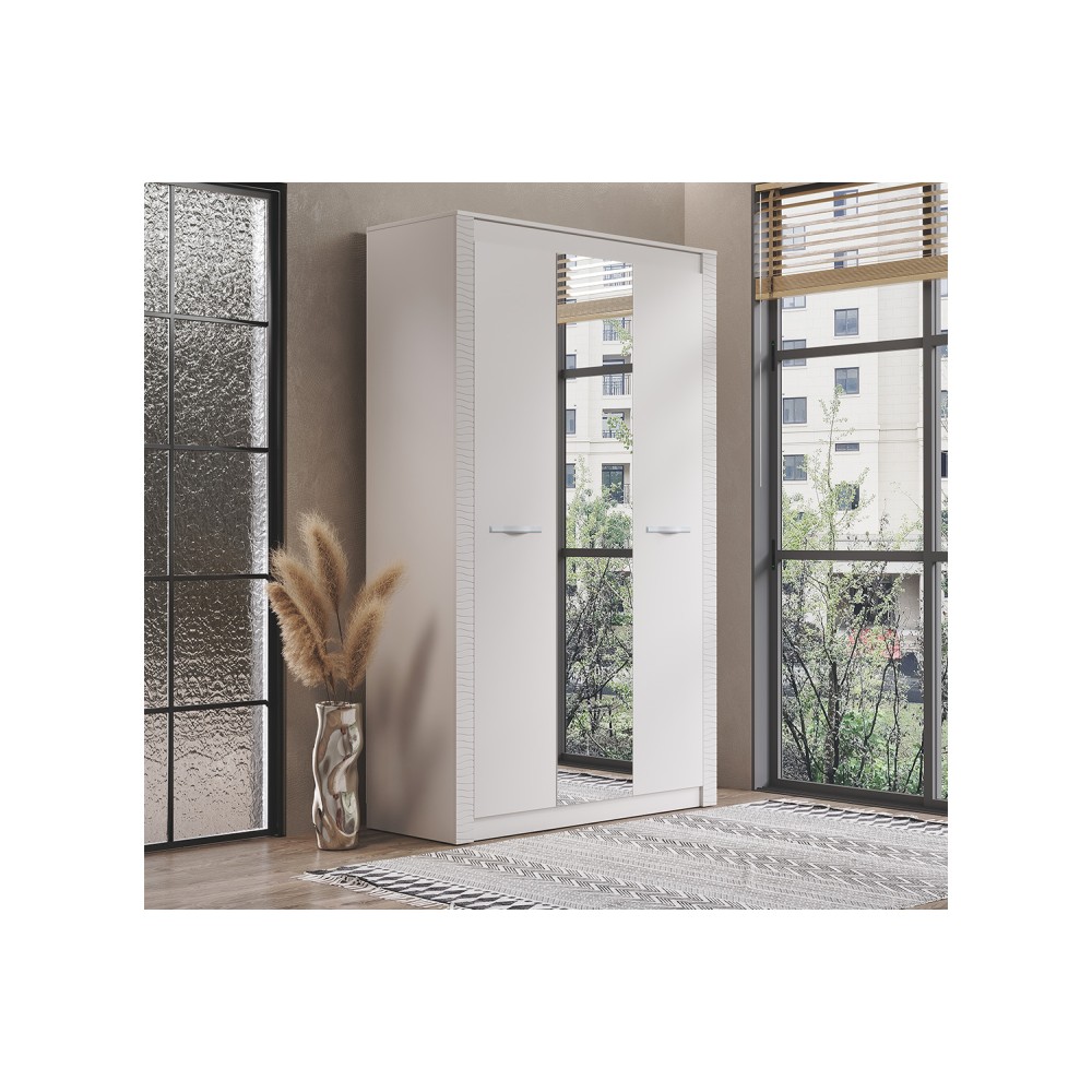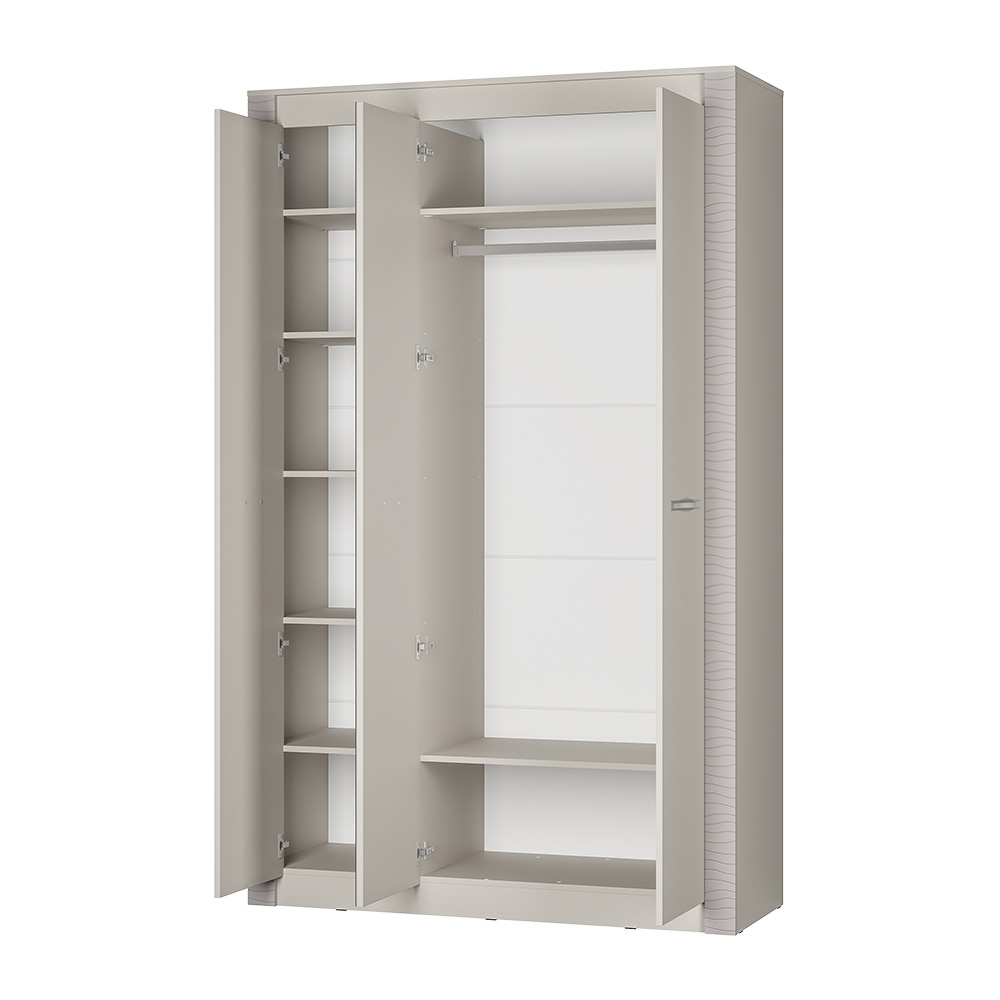 Трехстворчатый шкаф "Монако" относится к одноименной модульной серии. Модель не имеет вычурного декора и лишних деталей, выполнена в сдержанном и лаконичном стиле. Комплектация шкафа представляет собой несколько полок для хранения вещей в сложенном виде, а также отделение с хромированной штангой для одежды на вешалках. Для создания модели используется качественная ЛДСП цвета "кашемир". Центральная створка является полностью зеркальной, две остальные дополнены изящными ручками.