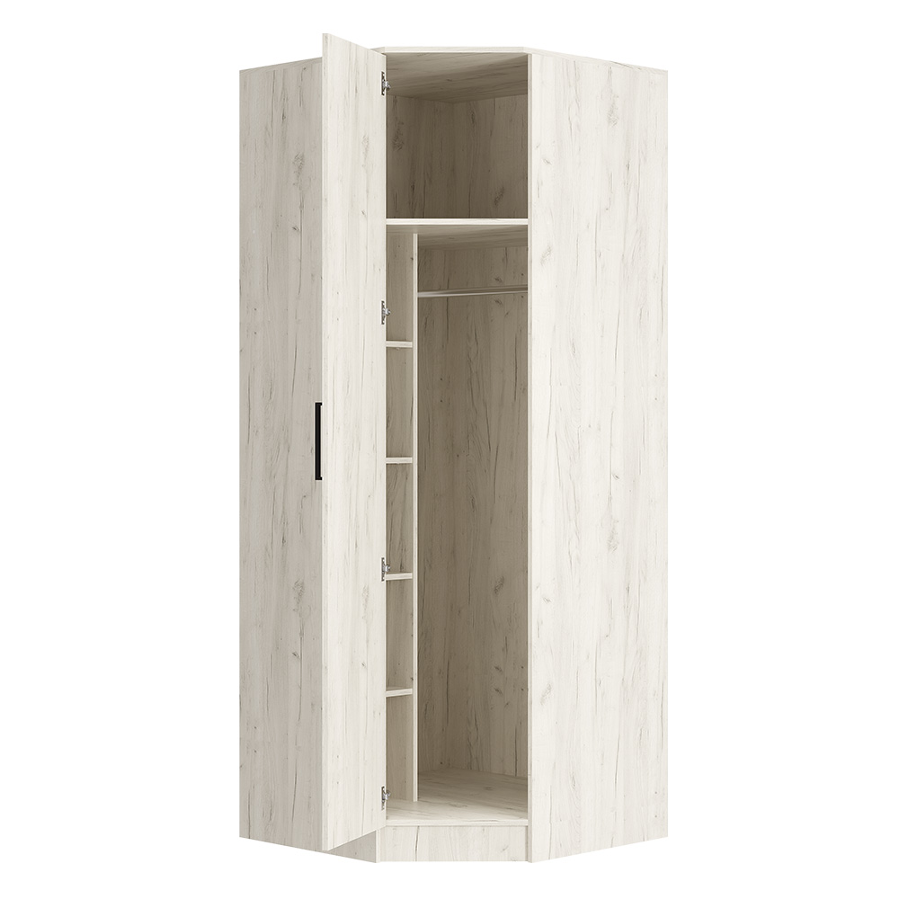 Рационально использовать пространство в комнате, при этом организовать хранение гардероба поможет угловой шкаф Фиеста. Внутренне наполнение со штангой и многочисленными полками позволит разместить одежду и обувь.