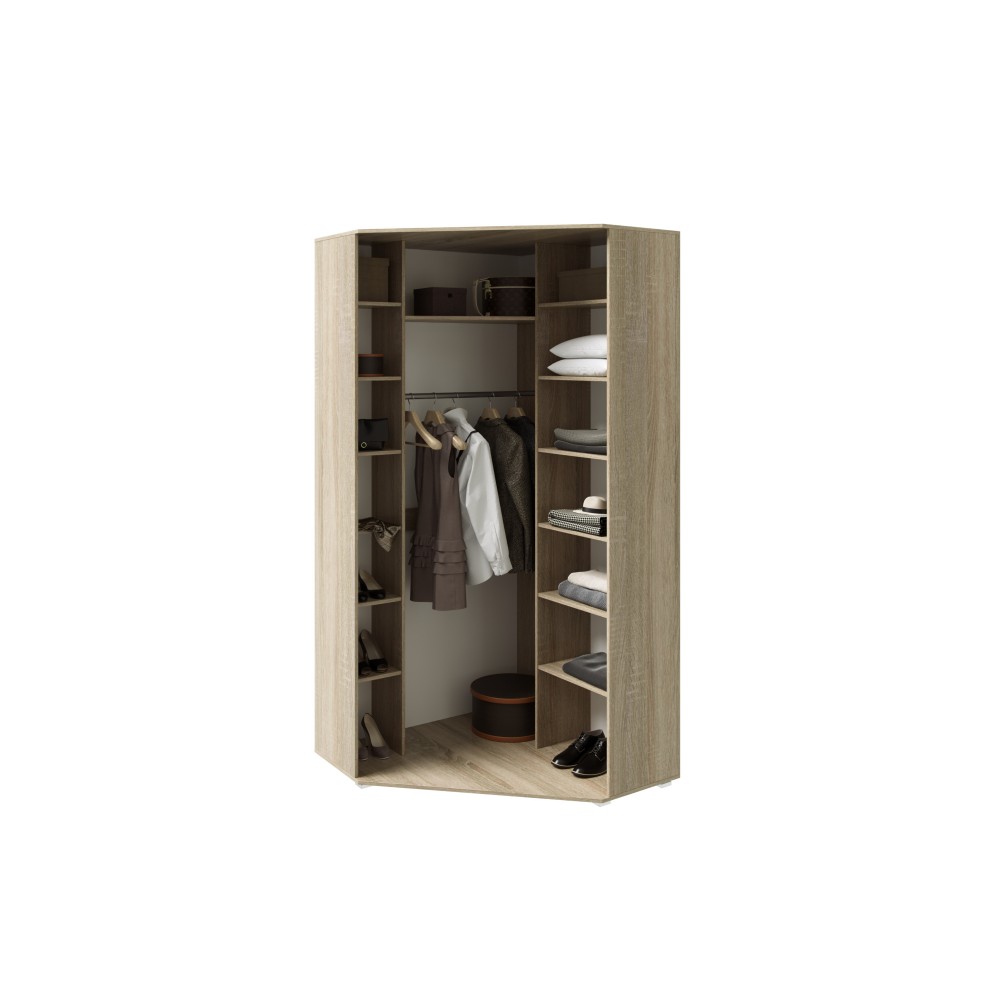Рационально использовать пространство в комнате, при этом организовать хранение гардероба поможет угловой шкаф Ким Внутренне наполнение со штангой и многочисленными полками позволит разместить, одежду и обувь.