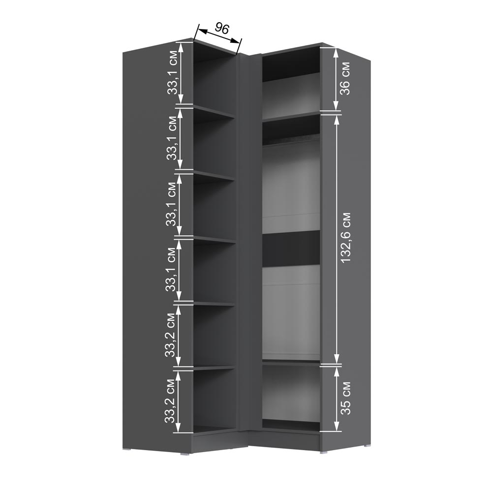 Рационально использовать пространство в комнате, при этом организовать хранение гардероба поможет угловой шкаф Вегас. Внутренне наполнение со штангой и многочисленными полками позволит разместить одежду и обувь.