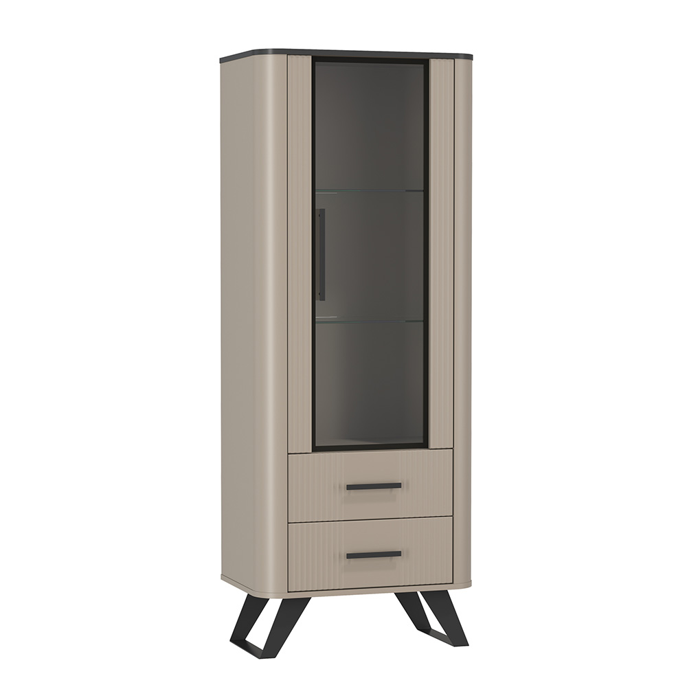 Шкаф-витрина узкий имеет одну стеклянную дверцу, за которой также расположились две стеклянные полки. Нижняя часть узкого шкафавитрины напоминает комод с двумя ящиками.