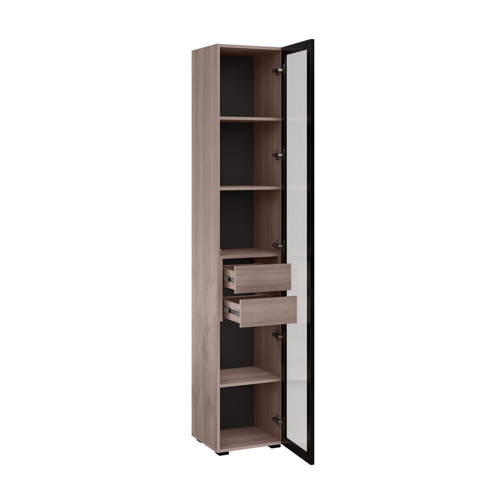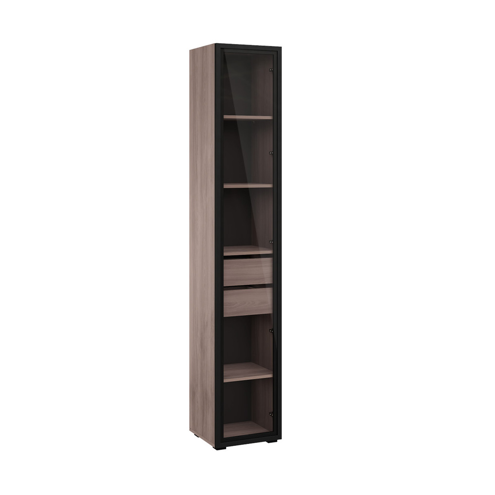 Стильный шкаф-витрина из коллекции «Роквуд» сочетает в себе лаконичную эстетику минимализма с практичной функциональностью. Изящный фасад из тонированного стекла придаёт лёгкость конструкции, позволяя демонстрировать содержимое, сохраняя его от пыли. Внутри — пять удобных полок (нагрузка до 8 кг каждая) и два выдвижных ящика (до 5 кг) с плавным ходом для систематизации коллекций, книг или декора.