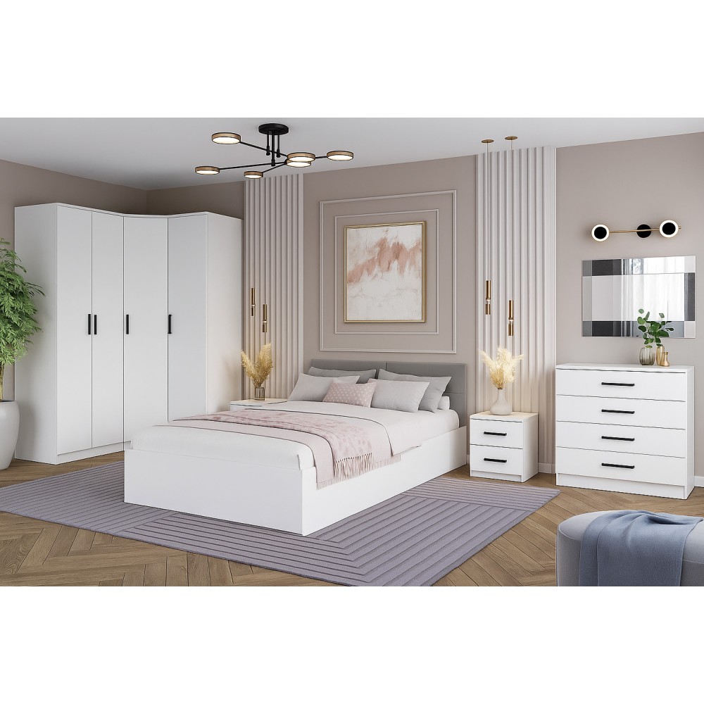 Коллекция мебели для спальни Фьюжн является воплощением эстетики минимализма. Белый цвет в сочетании с черной фурнитурой, строгие линии, простой конструктив – все это лучшие черты мебельного дизайна.