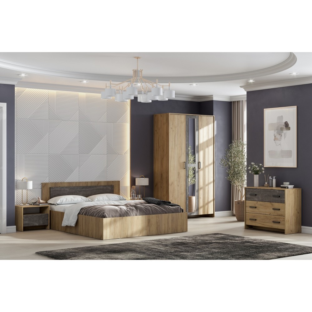 В спальный гарнитур вошли комод с выкатными ящиками, две удобные прикроватные тумбы с ящиками и открытыми нишами, большой шкаф для одежды и белья и, конечно, удобная двуспальня кровать 160х200.