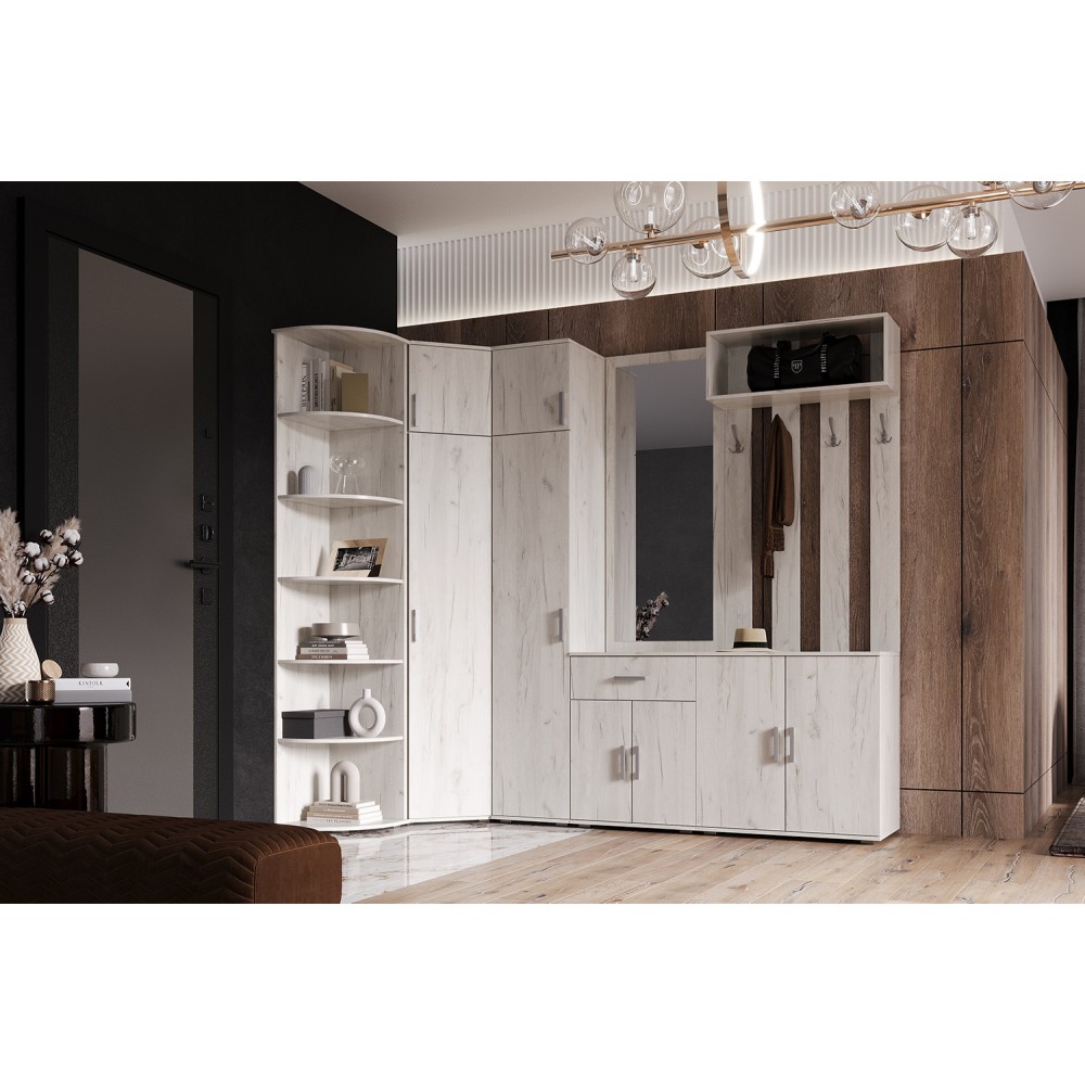 Угловое завершение из коллекции Ева выступит дополнением к основной шкафной группе и подарит дополнительное место для хранения различных вещей: книг, цветов, предметов декора и памятных вещиц, которые должны быть на виду. Благодаря большому количеству полок (5 штук), все Ваши вещи найдут место и будут содержаться в порядке.