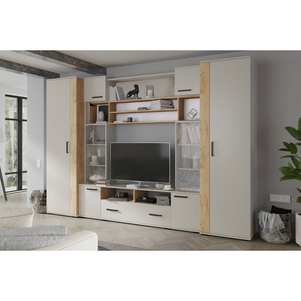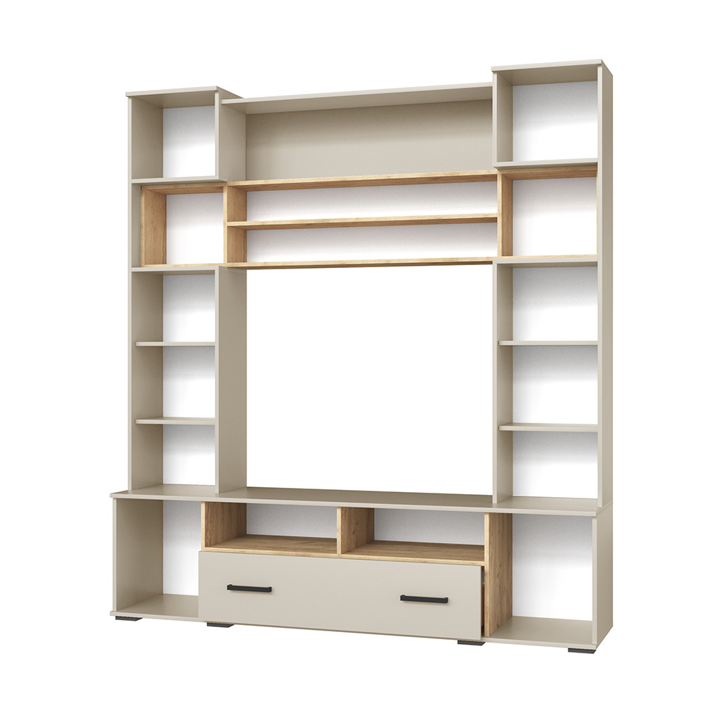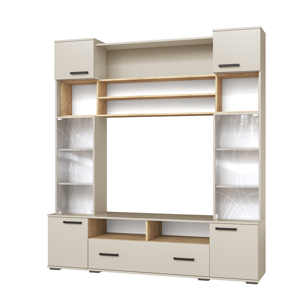 Стенка для гостиной Оскар-18 отличается не только приятным дизайном, но и увеличенной вместимостью. Ширина модуля 190 см, а это значит, что Вы сможете установить его даже в небольшой по площади квартире. Наполнение стенки - закрытые и отрытые полки, а также ящик. Это идеальный вариант для хранения книг, сервиза, посуды, предметов декора и памятных вещиц. Центром стенки выступает ниша под телевизор.