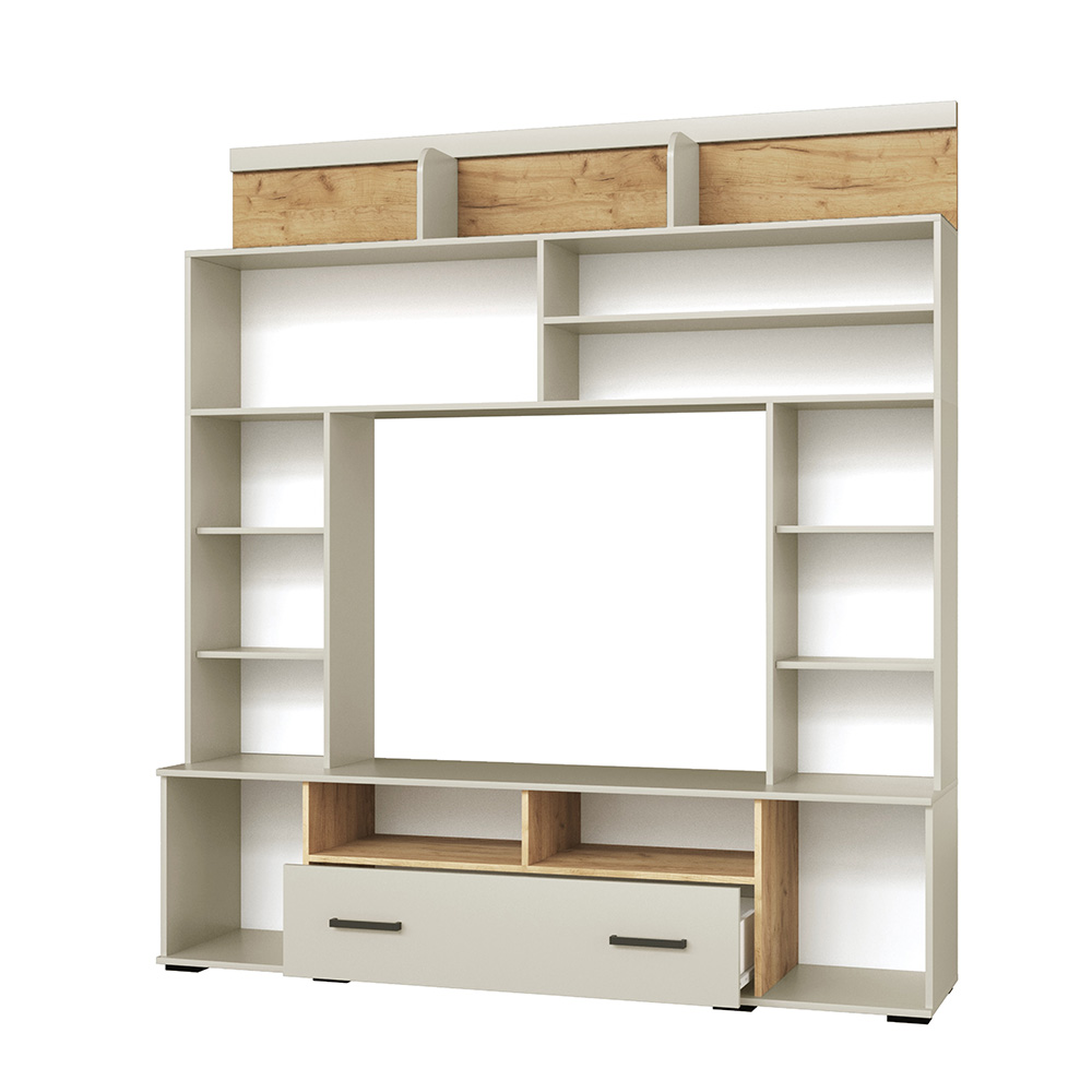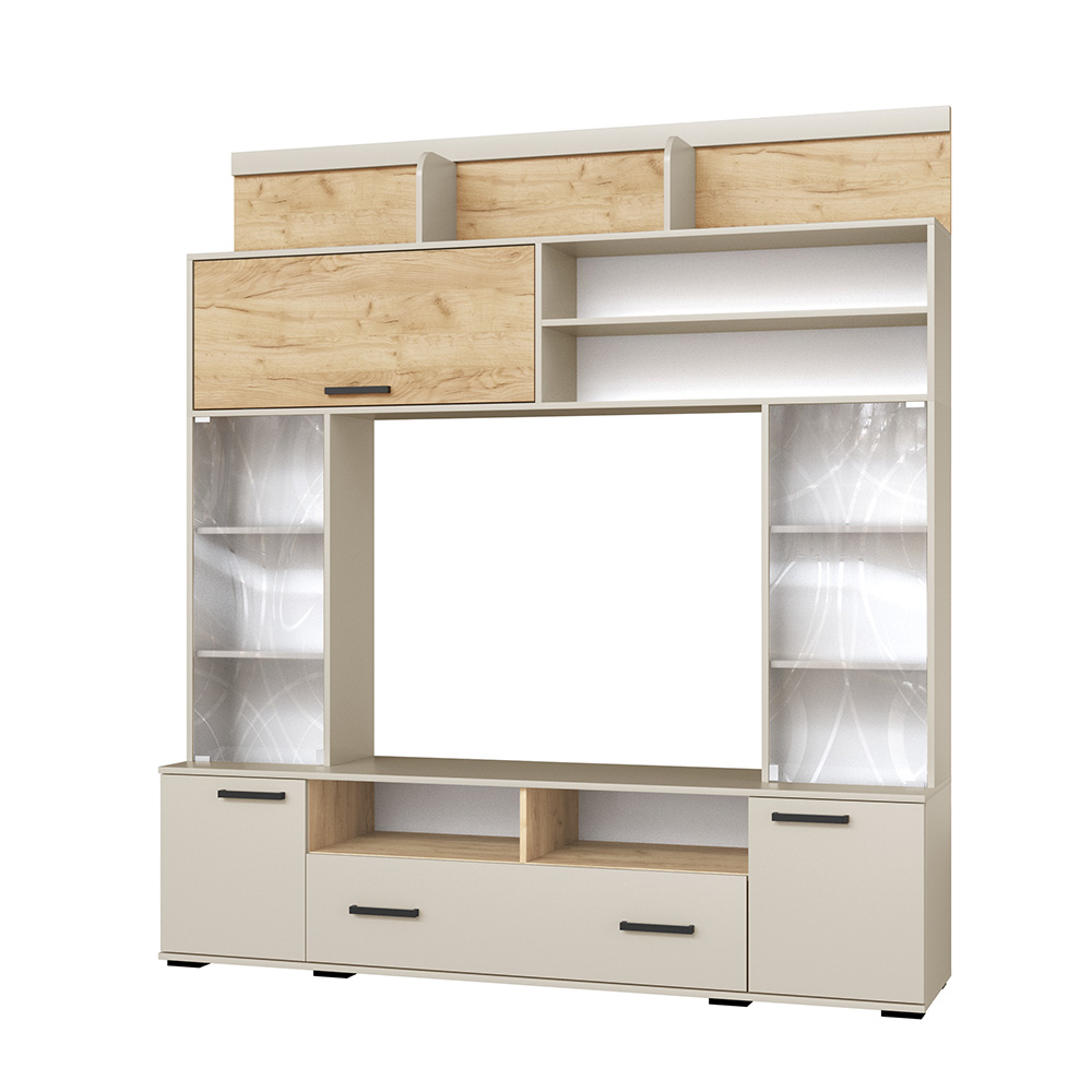 Стенка для гостиной Оскар-18 отличается не только приятным дизайном, но и увеличенной вместимостью. Ширина модуля 190 см, а это значит, что Вы сможете установить его даже в небольшой по площади квартире. Наполнение стенки - закрытые и отрытые полки, а также ящик. Это идеальный вариант для хранения книг, сервиза, посуды, предметов декора и памятных вещиц. Центром стенки выступает ниша под телевизор.