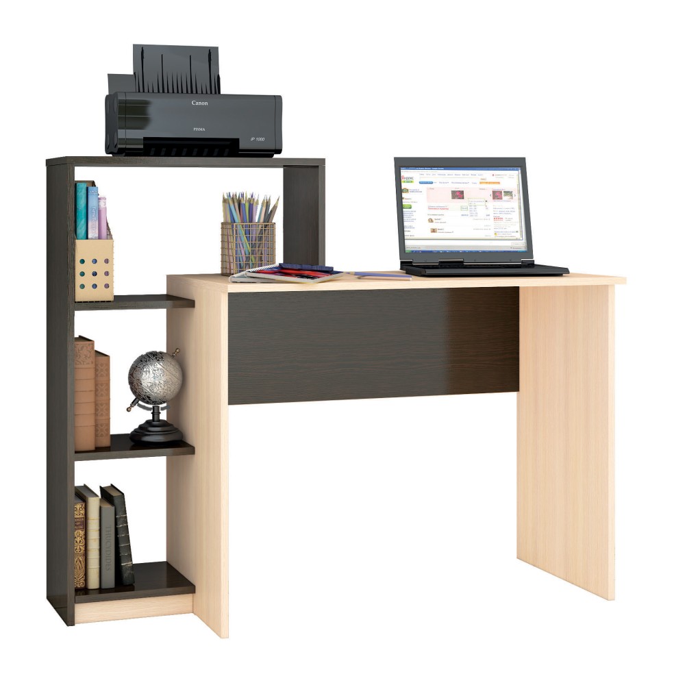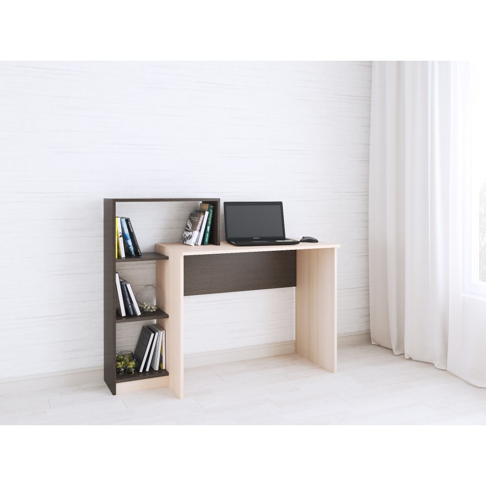 Компьютерный стол Квартет-2 сочетает в себе преимущества просторного письменного стола и вместительного стеллажа, превращаясь тем самым в полноценное рабочее место. На столе хватит места для ноутбука и настолько лампы, а на открытых полках - для книг, канцелярии и различных мелочей, которые необходимо иметь под рукой во время рабочего процесса. Пластиковые подпятники на опорах защитят напольное покрытие от деформации и царапин.