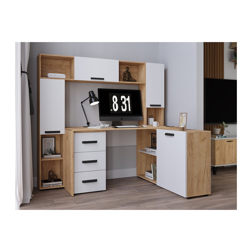 Модульную серию Квартет-13 можно использовать для создания мини-офиса или компактного рабочего места. Эффектный корпус в древесном декоре отлично сочетается с фасадами в цвете графит и в белом цвете с тиснением "древесные поры".