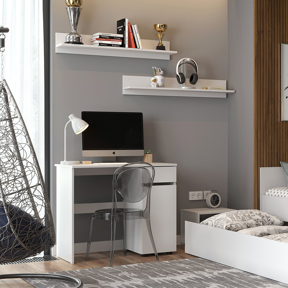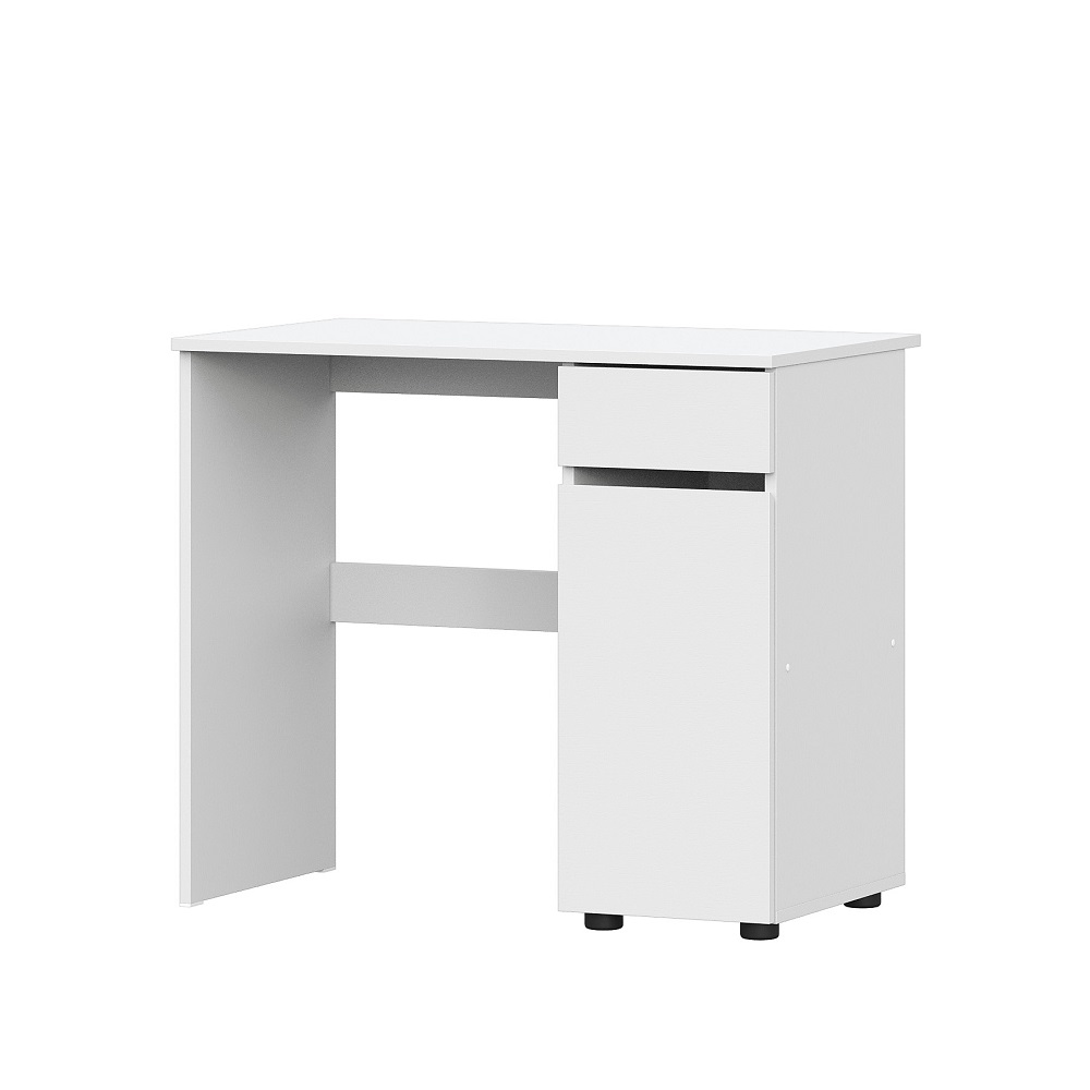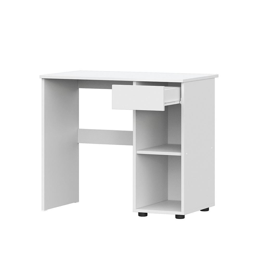 Белый письменный стол с выкатным ящиком и закрытой полкой. Это идеальное решение для малогабаритных комнат и квартир-студий, в которых необходимо оборудовать рабочее место. Фасады ящика и ниши не имеют ручек, открываются на скос в верхней части