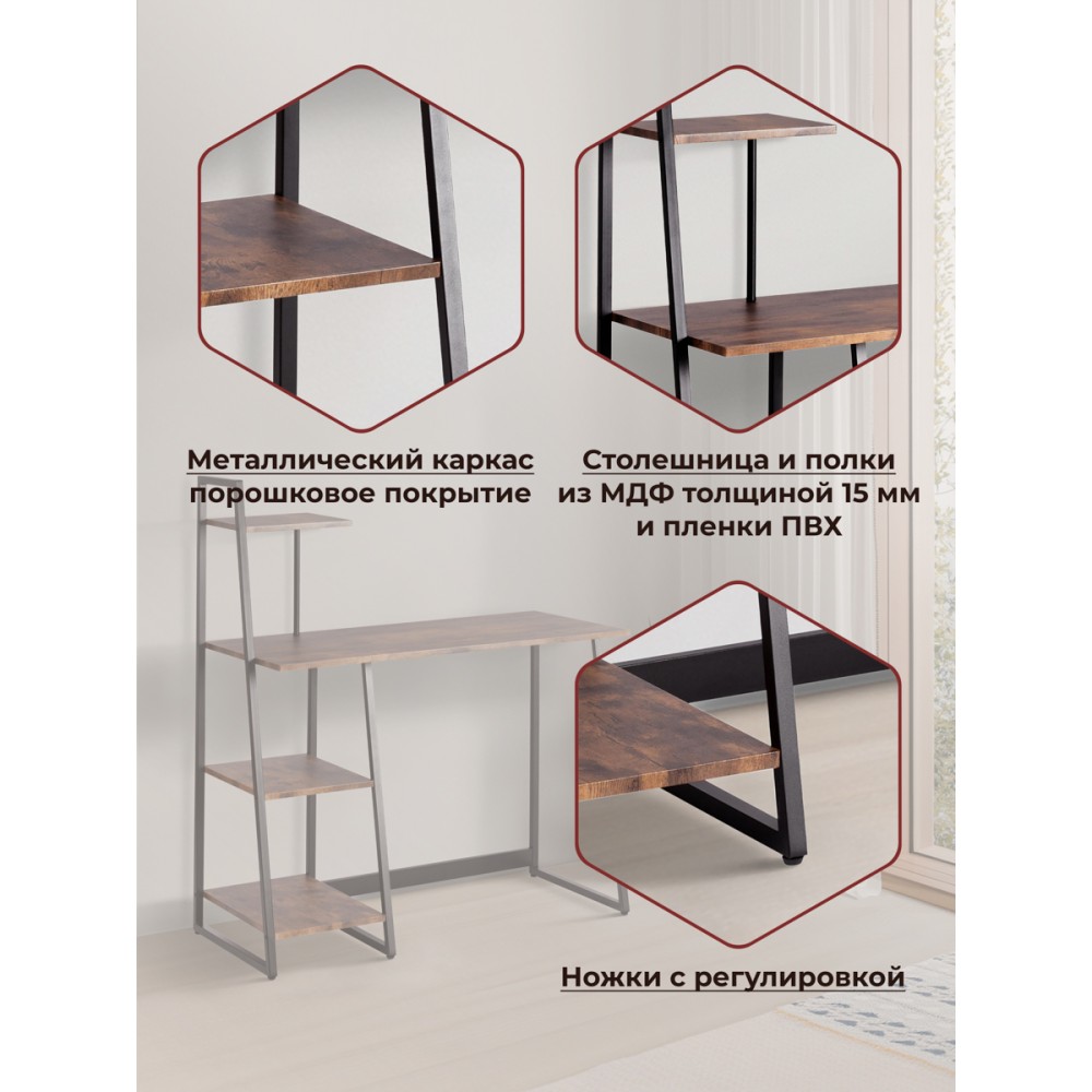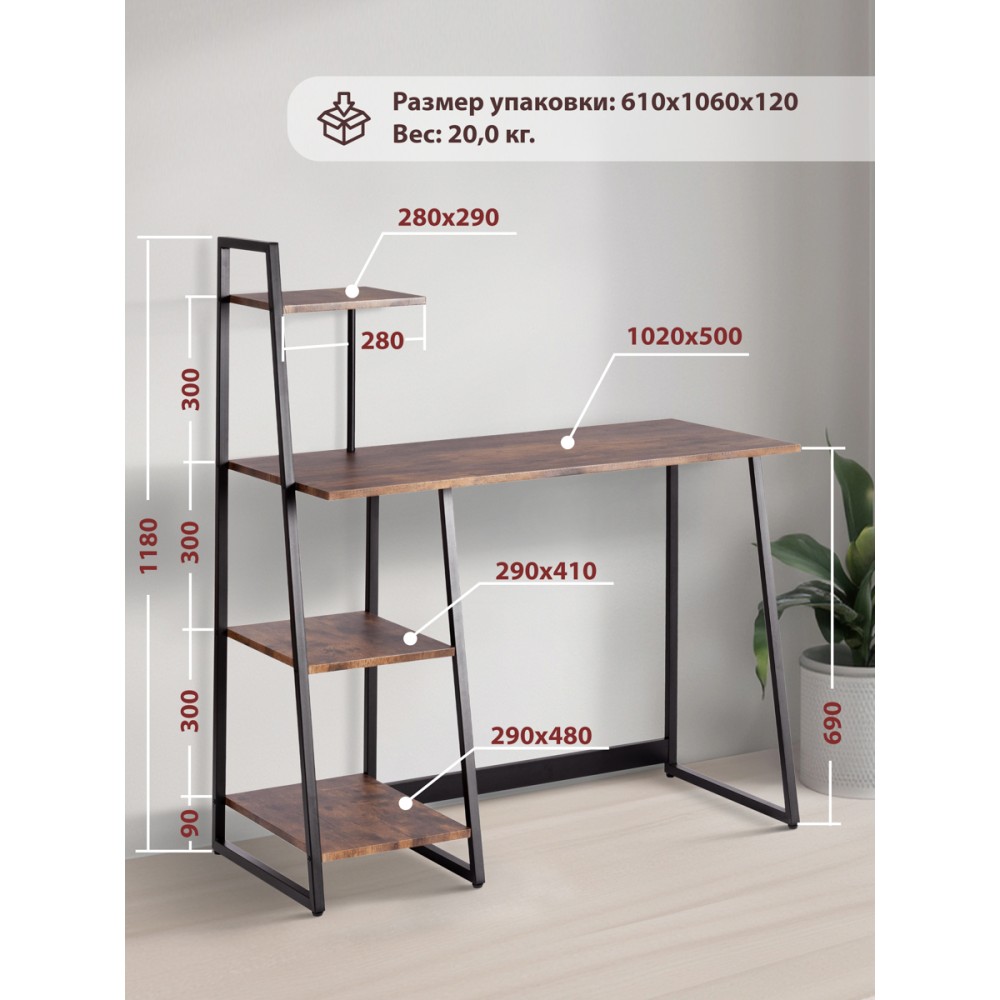 Оригинальный компьютерный стол WD-16 является практичным и функциональным предметом мебели для рабочего кабинета в доме или в офисе. Широкая прямоугольная столешница изготовлена из МДФ толщиной 15 мм. Такой материал обладает высокой прочностью, прост в уходе, имеет долгий срок службы, устойчив к механическим повреждениям и термическому воздействию. Каркас модели выполнен из металла с порошковым покрытием, которое защищает поверхность от влаги, предотвращает появление ржавчины. Основательные ножки с регулировкой отлично компенсируют неровности пола, что придает модели безопасность и устойчивость. В стол интегрирован вместительный стеллаж, с помощью которого можно правильно организовать рабочее пространство, не загромождая поверхность столешницы. На полках удобно хранить папки с документами, канцелярские принадлежности, оргтехнику, комнатные растения, необычные предметы дизайна и другие аксессуары. Компьютерный стол в стиле лофт с черным каркасом и столешницей в текстуре burnt обладает привлекательным внешним видом, способен украсить любое помещение, поможет создать в доме или офисе атмосферу уюта и комфорта. Модель WD-16 поставляется в разобранном виде, требуется простая сборка по прилагаемой инструкции. Стол может быть дополнительно укомплектован стеллажами WS-01 и WS-02 в текстуре burnt.
