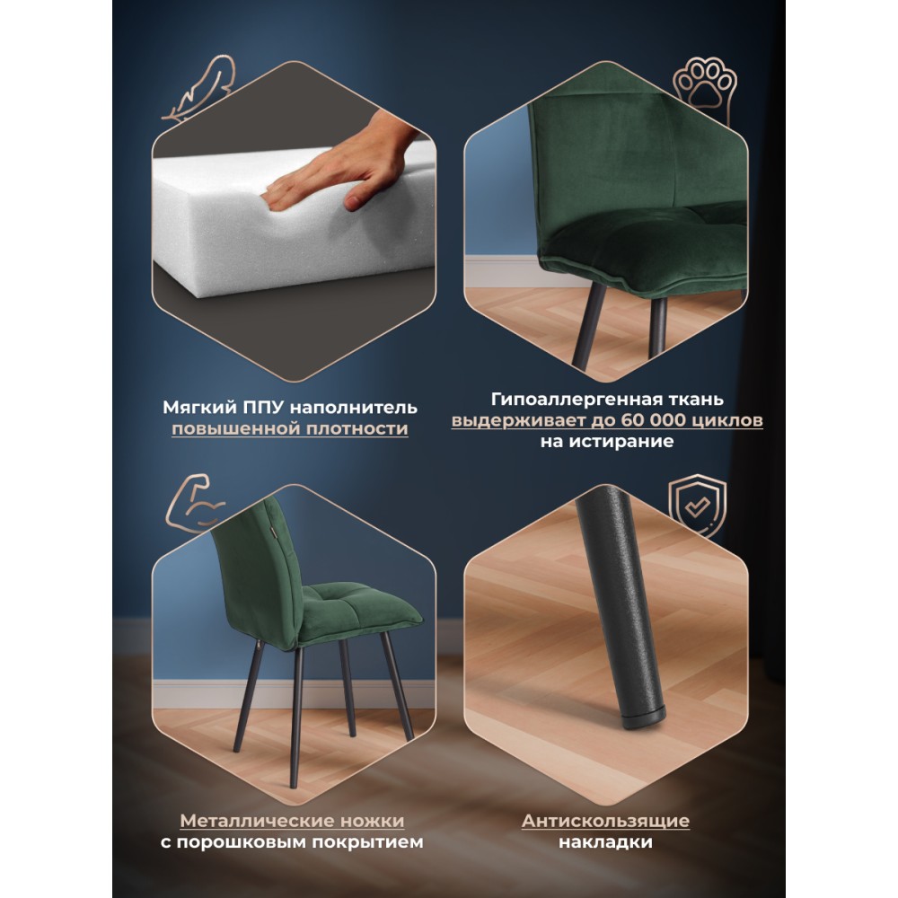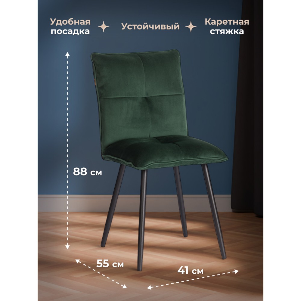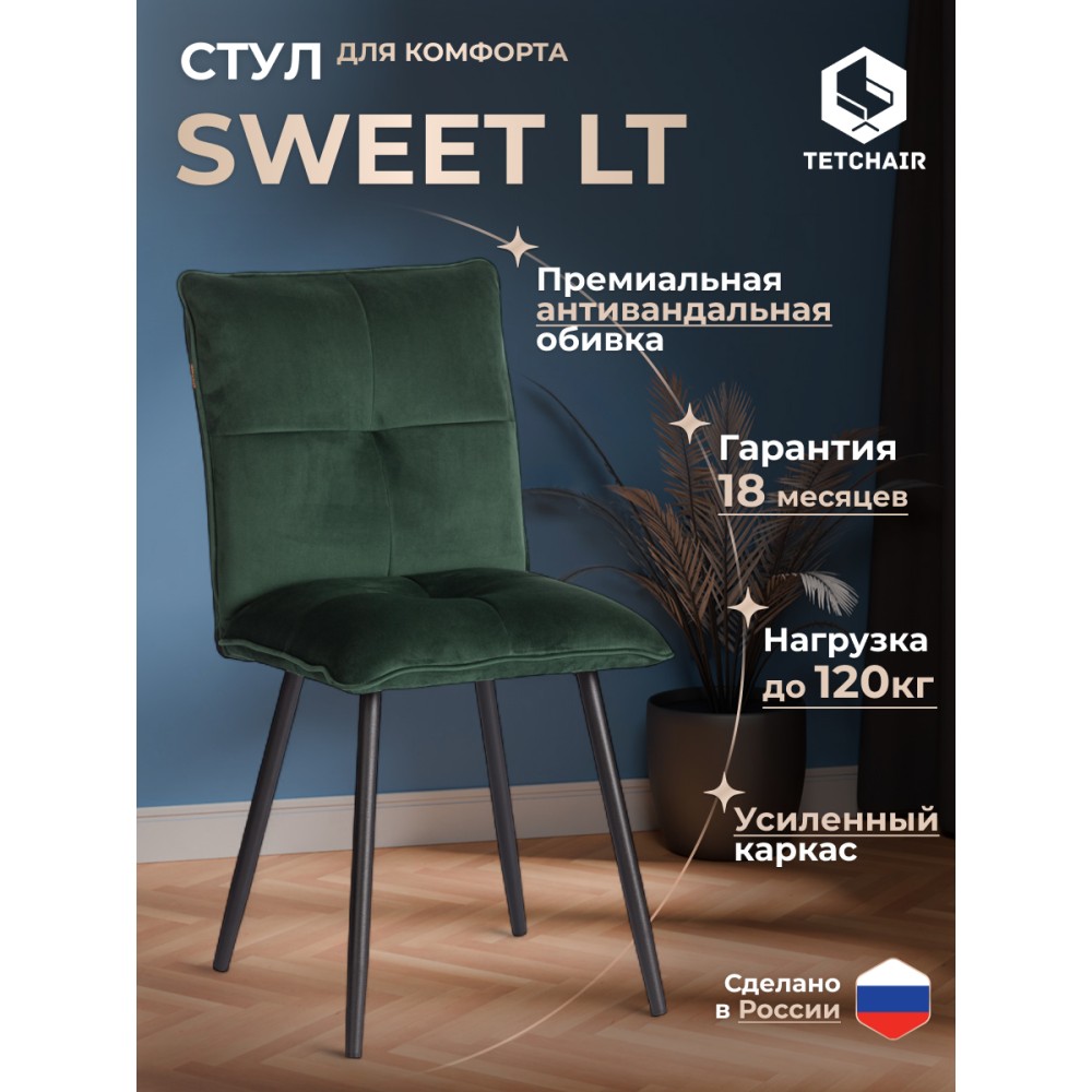 Стул Sweet LT - отличная возможность разнообразить интерьер городской квартиры или загородного дома. Оригинальная модель отлично подойдет для кухни, спальни, гостиной, столовой или прихожей. Каркас и спинка: ОКРАШЕННЫЙ металлический профиль обеспечивает надежность и долговечность, а высокая, эргономичная спинка с эффектом "Гамака" обеспечивает комфорт во время сидения. Сиденье: гнутоклееный шпон толщиной 10 мм придаёт надежность и несет функцию несущей конструкции, не деформируются со временем, выдерживают любые виды нагрузок. Наполнитель из пенополиуретана (ППУ) высокой плотности (35 кг/м3) сохраняет свой форму на протяжении длительного времени, обеспечивая комфорт ПРИ СИДЕНИИ. Обивка из велюра не только приятна на ощупь, но и устойчива к износу, что делает этот стул идеальным для повседневного использования. Прочные конусообразные металлические опоры диаметром 26/16 мм с толщиной металла 1,2 мм надежны и устойчивы к усиленной эксплуатации. Вместительное сиденье, удобная спинка, привлекательный дизайн – модель Sweet LT идеально впишется в любой современный интерьер и станет стильным акцентом в домашнем пространстве. Стул поставляется в разобранном виде, необходима простая сборка по прилагаемой инструкции. Стул рассчитан на статичную максимальную нагрузку до 120 кг.