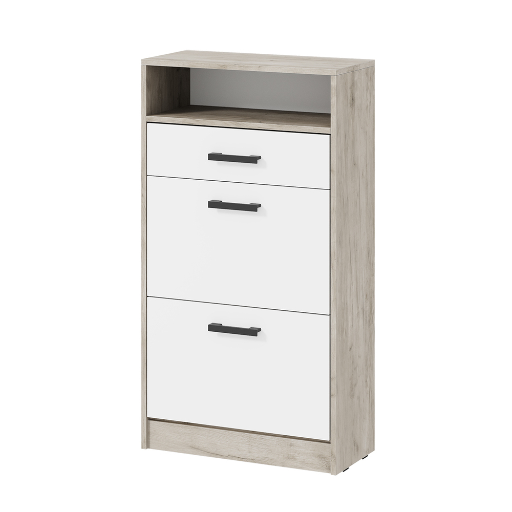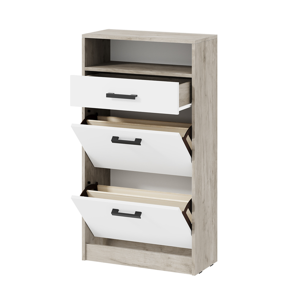 Закрытая обувница имеет 2 отделения для обуви за откидными дверями. В каждом из них есть разделитель.