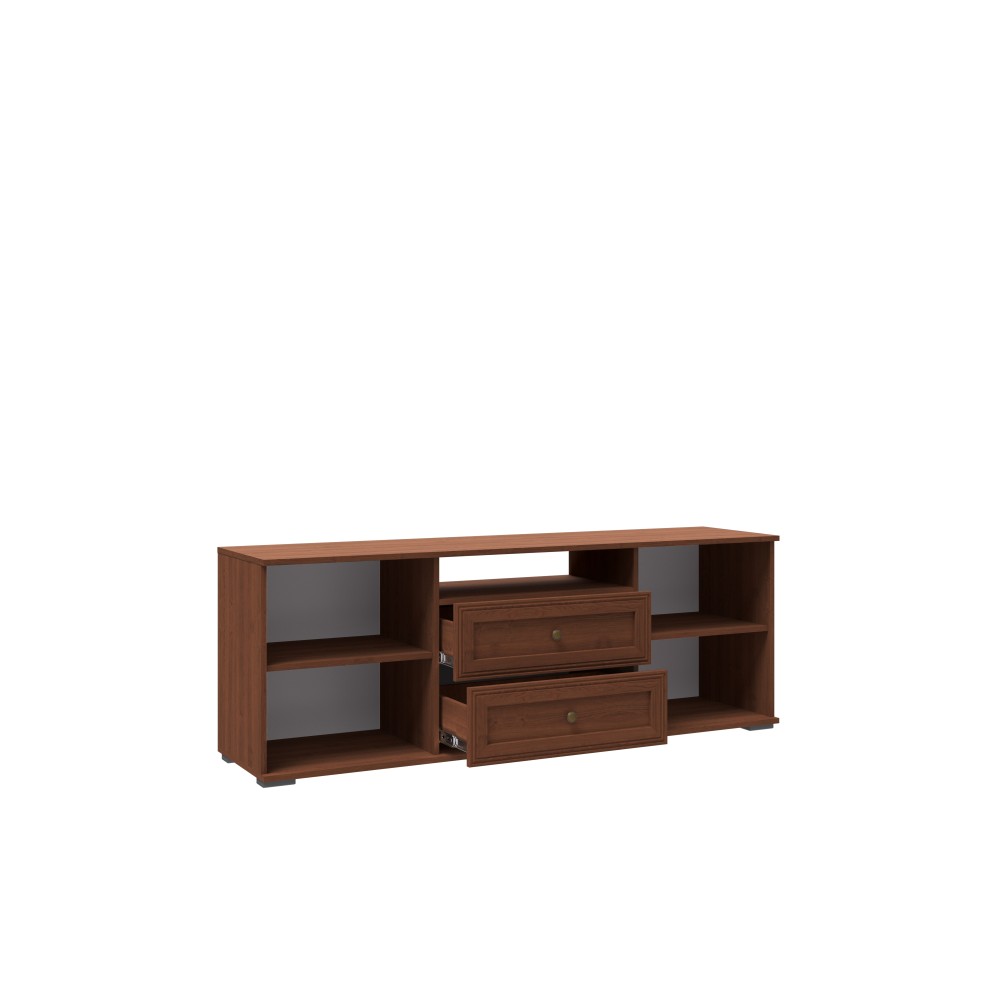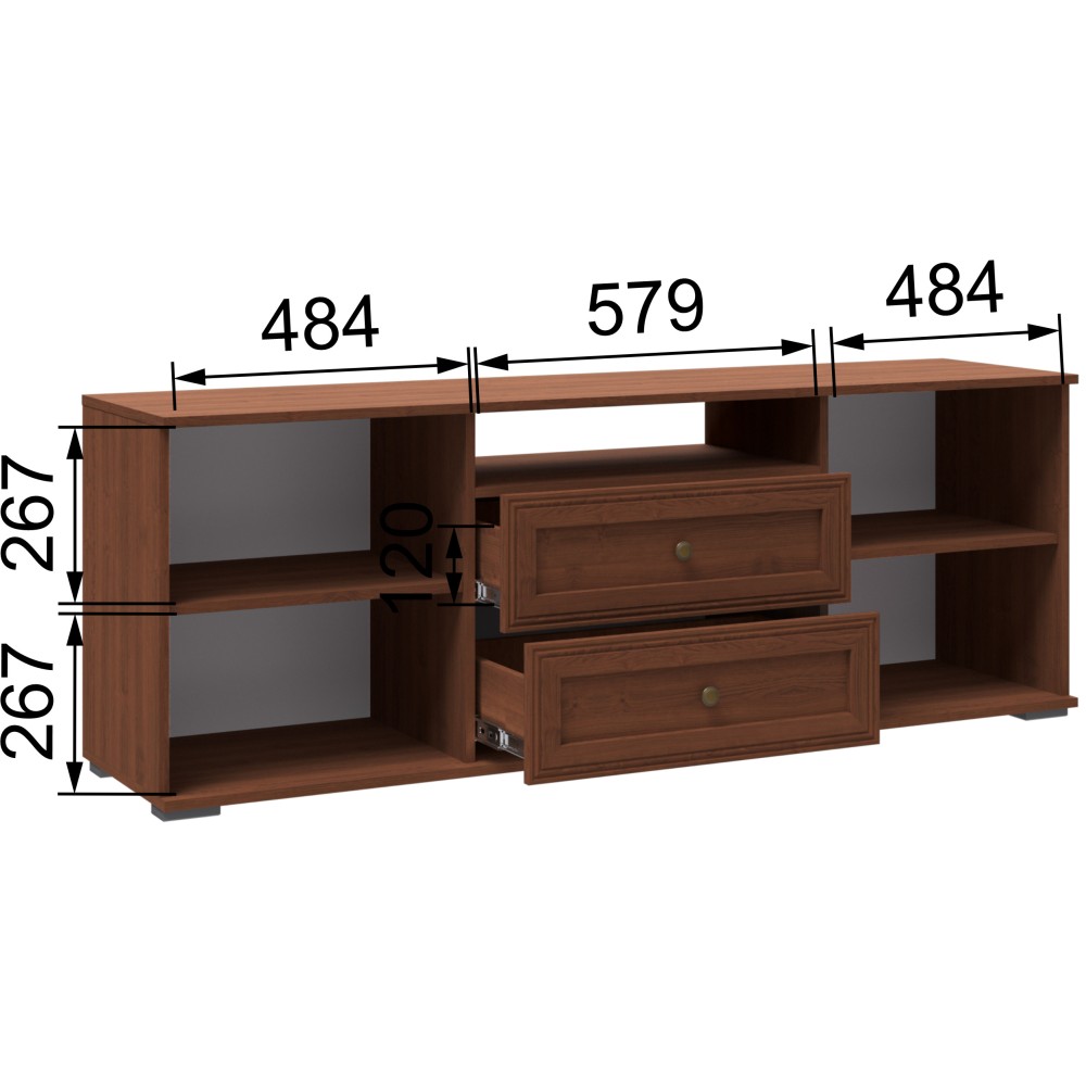 В конструкции предусмотрена открытая полка, которая отлично подойдёт для устройств повседневного использования или хранения необходимых мелочей с быстрым доступом. По бокам тумбы расположены распашные дверцы, за которыми находятся полки для аккуратного хранения различных предметов. Дополняют функциональность модели два вместительных выдвижных ящика, позволяющих удобно разместить аксессуары, документы или другие вещи, сохраняя порядок и эстетичный внешний вид.